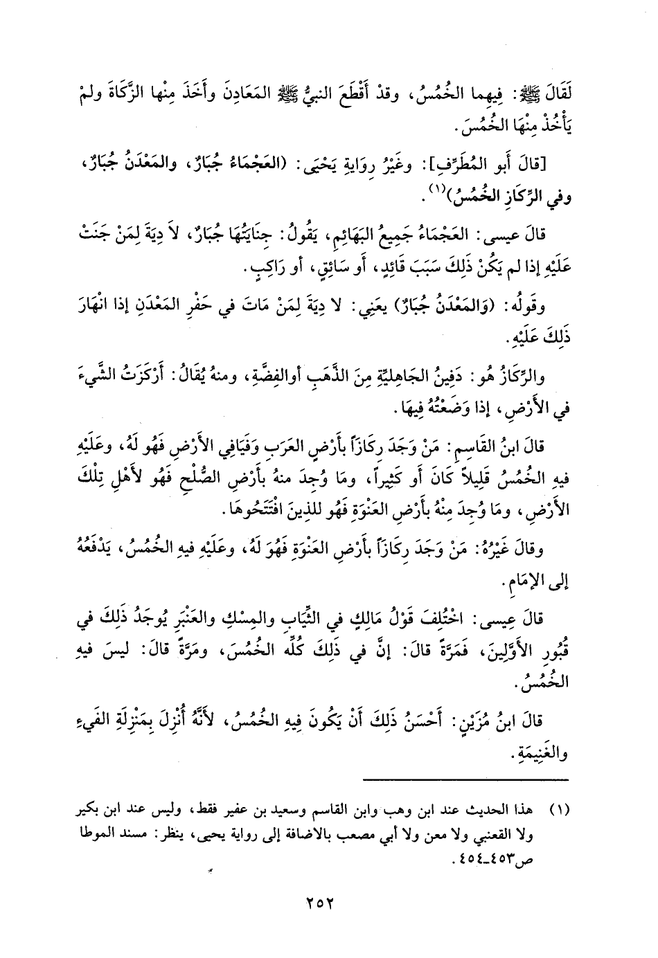 [قالَ أَبو المُطَرِّفِ]: وغَيْرُ رِوَايةِ يحيى: (العَجْمَاءُ جُبَارٌ، والمَعْدَنُ جُبَارٌ، وفى الرِّكَازِ الخُمُسُ) (¬1).