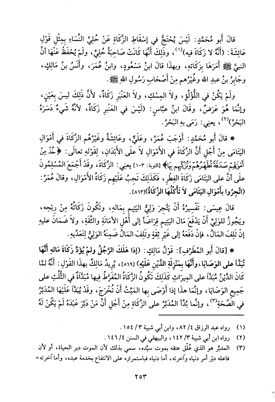 * قالَ أَبو مُحَمَّدٍ: أَوْجَبَ عُمَرُ، وعَلَيٌّ، وعَائِشَةُ وغَيْرُهُم الزَّكَاةَ في أَمْوَالِ اليَتَامَى مِنْ أَجْلِ أَنَّ الزَّكَاةَ في الأَمْوَالِ لَا علَى الأَبْدَانِ، لِقَوْلهِ تعالَى: {خُذْ مِنْ أَمْوَالِهِمْ صَدَقَةً تُطَهِّرُهُمْ وَتُزَكِّيهِمْ بِهَا} [التوبة: 103] يعنِي: الزَّكَاةَ، وقَدْ أَجْمَعَ المُسْلِمُونَ علَى أنَ على اليَتَامَى زَكَاةَ الفِطْرِ، فَكَذَلِكَ تَجِبُ عَلَيْهِم زَكَاةُ الأَمْوَالِ، وقالَ عُمَرُ: (اتَّجِرُوا بأَمْوَالِ اليَتَامَى لَا تَأْكُلُهَا الزكَاة) [863].