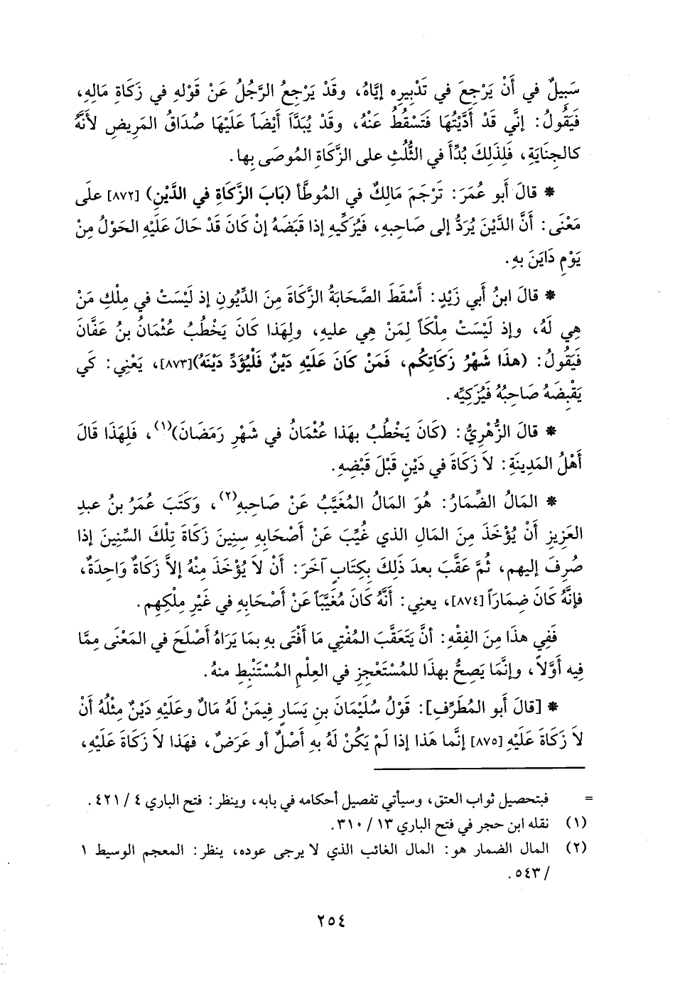 * قالَ ابنُ أَبي زَيْدٍ: أَسْقَطَ الصَّحَابَةُ الزَّكَاةَ مِنَ الدِّيُونِ إذ لَيْسَتْ في مِلْكِ مَنْ هِي لَهُ، وإذ لَيْسَتْ مِلْكًا لِمَنْ هِي عليهِ، ولِهَذا كَانَ يَخْطُبُ عُثْمَانُ بنُ عَفَّانَ فَيَقُولُ: (هذَا شَهْرُ زَكَاتِكُم، فَمَنْ كَانَ عَلَيْهِ دينٌ فَلْيُؤَدِّ دَيْنَهُ) [873]، يَعْنِي: كَي يَقْبِضَهُ صَاحِبُهُ فَيُزَكِيِّه.