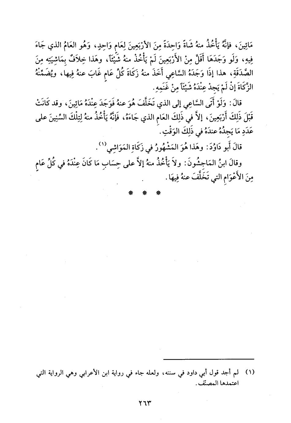 مَائِينَ، فإنَّهُ يَأْخُذُ منهُ شَاةً وَاحِدَةً مِنَ الأرْبَعِينَ لِعَامٍ وَاحِدٍ، وَهُو العَامُ الذي جَاءَ فِيهِ، وَلَو وَجَدَهَا أَقَلَّ مِنْ الأَرْبَعِينَ لَمْ يَأْخُذْ منهُ شَيْئَاً، وهَذا خِلاَف بِمَاشِيَتِه مِنَ الصَّدَقَةِ، هذا إذَا وَجَدَهُ السَّاعِي أَخَذَ مثهُ زَكَاةَ كُلِّ عَامٍ غَابَ عنهُ فِيها، ويُضَمِّنْهُ الزَّكَاةَ إنْ لَمْ يَجِدْ عِنْدَهُ شَيْئَاً مِنْ غَنَمِهِ.