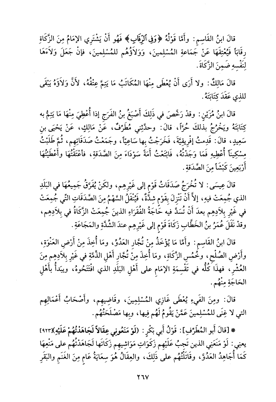 قالَ ابنُ القَاسِمِ: وأَمَّا قَوْلُهُ {وَفِي الرِّقَابِ} فَهُو أَنْ يَشْتَرِي الإمَامُ مِنَ الزَّكَاةِ رِقَابَا فَيُعْتِقَهَا عَنْ جَمَاعةِ المُسْلِمينَ، وَوَلاَؤُهُم للمُسْلِمينَ، فإنْ جَعَلَ وَلاَءَهَا لِنَفْسِهِ ضَمِنَ الزَّكَاةَ.