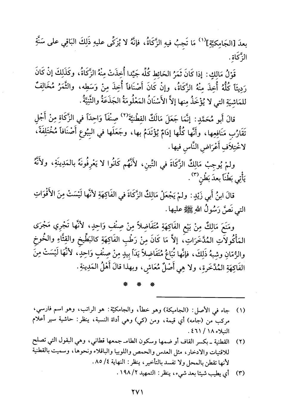 قالَ ابنُ أَبي زَيْدٍ: ولمْ يَجْعَلْ مَالِكٌ الزَّكَاةَ في الفَاكِهَةِ لأنَّها لَيْسَتْ مِنَ الأَقْوَاتِ التي نَصَّ رَسُولُ اللهِ - صلى الله عليه وسلم - عليها.