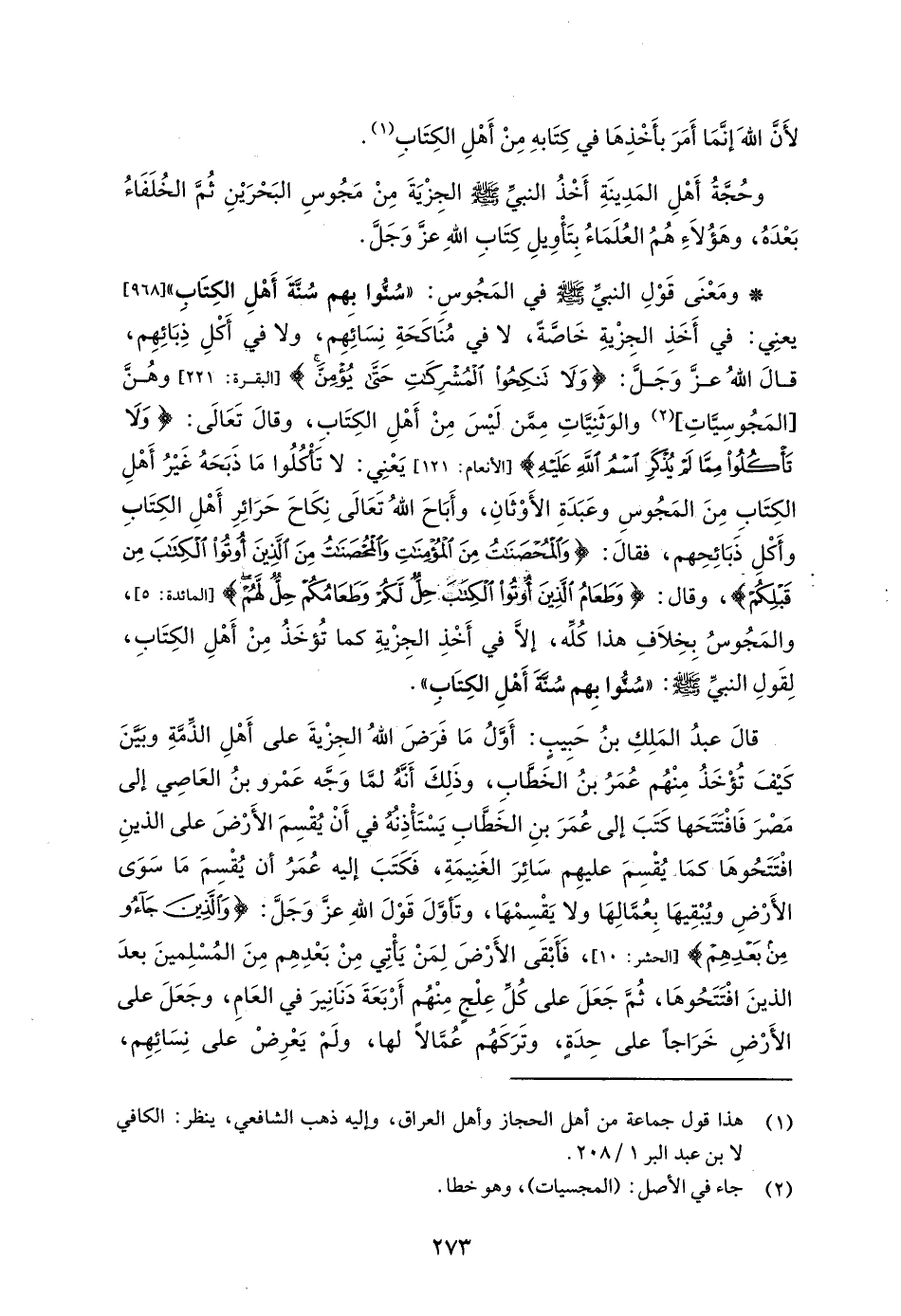 * ومَعْنَى قَوْلِ النبيِّ - صلى الله عليه وسلم - في المَجُوسِ: "سُنُّوا بِهم سُنَّةَ أَهْلِ الكِتَابِ " [968]، يعنِي: في أَخَذِ الجِزْيةِ خَاصَّةً، لا في مُنَاكَحَةِ نِسَائِهِم، ولا في أَكْلِ ذِبَائِهِم، قالَ اللهُ -عَزَّ وَجَلَّ-: {وَلَا تَنْكِحُوا الْمُشْرِكَاتِ حَتَّى يُؤْمِنَّ} [البقرة:221] وهُنَّ [المَجُوسِيَّاتِ] (¬2) والوَثَنِيَّاتِ مِمَّن لَيْسَ مِنْ أَهْلِ الكِتَابِ، وقالَ تَعَالَى: {وَلَا تَأْكُلُوا مِمَّا لَمْ يُذْكَرِ اسْمُ اللَّهِ عَلَيْهِ} [الأنعام: 121] يَعْنِي: لا تَأْكُلُوا مَا ذَبَحَهُ غيْرُ أَهْلِ الكِتَابِ مِنَ المَجُوسِ وعَبَدَةِ الأَوْثَانِ، وأَبَاحَ اللهُ تَعَالَى نِكَاحَ حَرَائِرِ أَهْلِ الكِتَابِ وأَكْلِ ذَبَائِحِهم، فقالَ: {وَالْمُحْصَنَاتُ مِنَ الْمُؤْمِنَاتِ وَالْمُحْصَنَاتُ مِنَ الَّذِينَ أُوتُوا الْكِتَابَ مِنْ قَبْلِكُمْ}، وقال: {وَطَعَامُ الَّذِينَ أُوتُوا الْكِتَابَ حِلٌّ لَكُمْ وَطَعَامُكُمْ حِلٌّ لَهُمْ} [المائدة: 5]، والمَجُوسُ بِخِلاَفِ هذا كُلِّه، إلَّا في أَخْذِ الجِزْيةِ كما تُؤخَذُ مِنْ أَهْلِ الكِتَابِ، لِقَولِ النبيِّ - صلى الله عليه وسلم -: "سُنُّوا بِهم سُنَّةَ أَهْلِ الكِتَابِ".