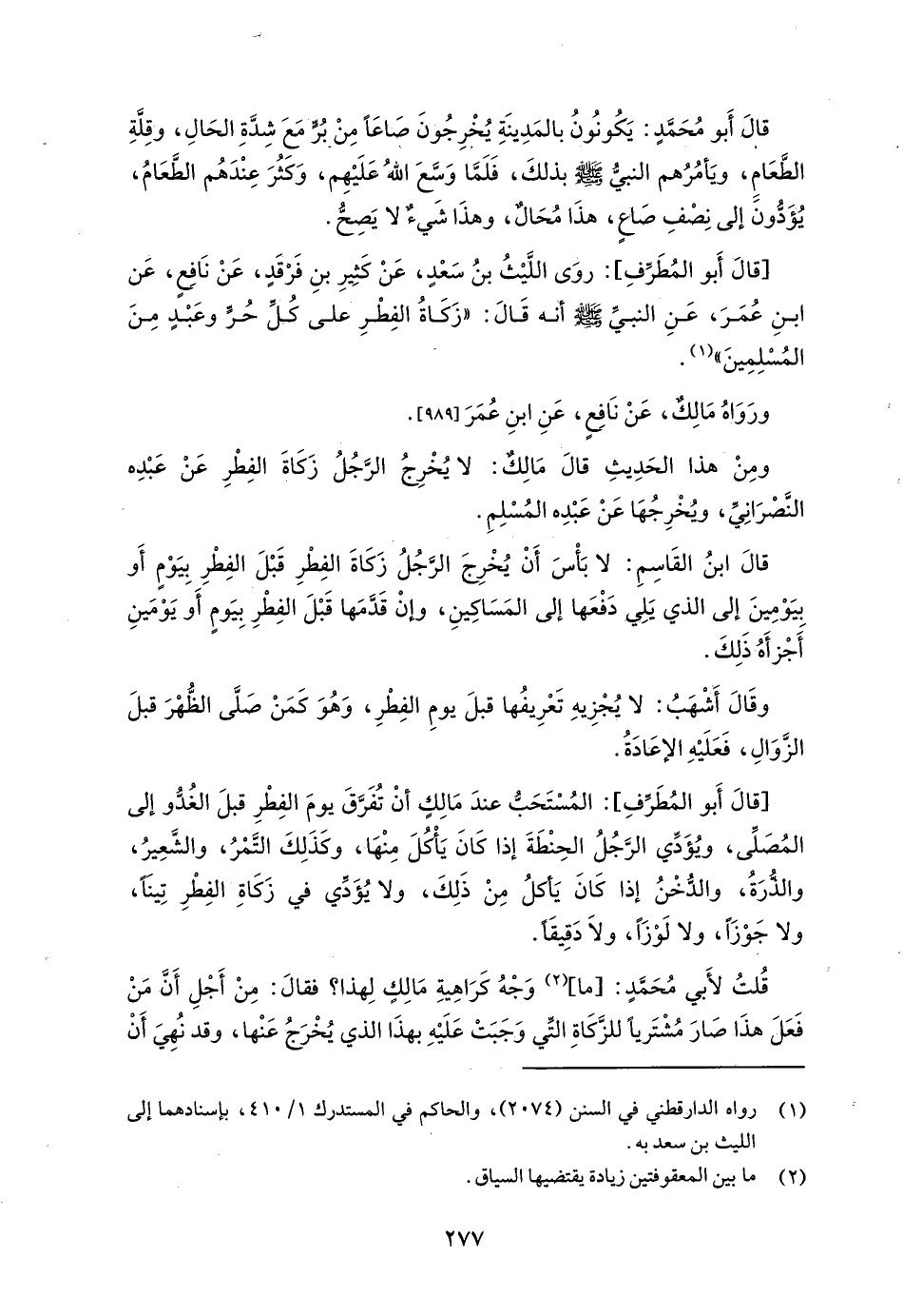 [قالَ أَبو المُطَرِّفِ]: روَى اللَّيْثُ بنُ سَعْدٍ، عَن كَثِيرِ بنِ فَرْقَدٍ، عَنْ نَافِعٍ، عَن ابنِ عُمَرَ، عَنِ النبيِّ - صلى الله عليه وسلم - أنه قَالَ: "زَكَاةُ الفِطْرِ على كُلِّ حُرٍّ وعَبْدٍ مِنَ المُسْلِمِينَ" (¬1).