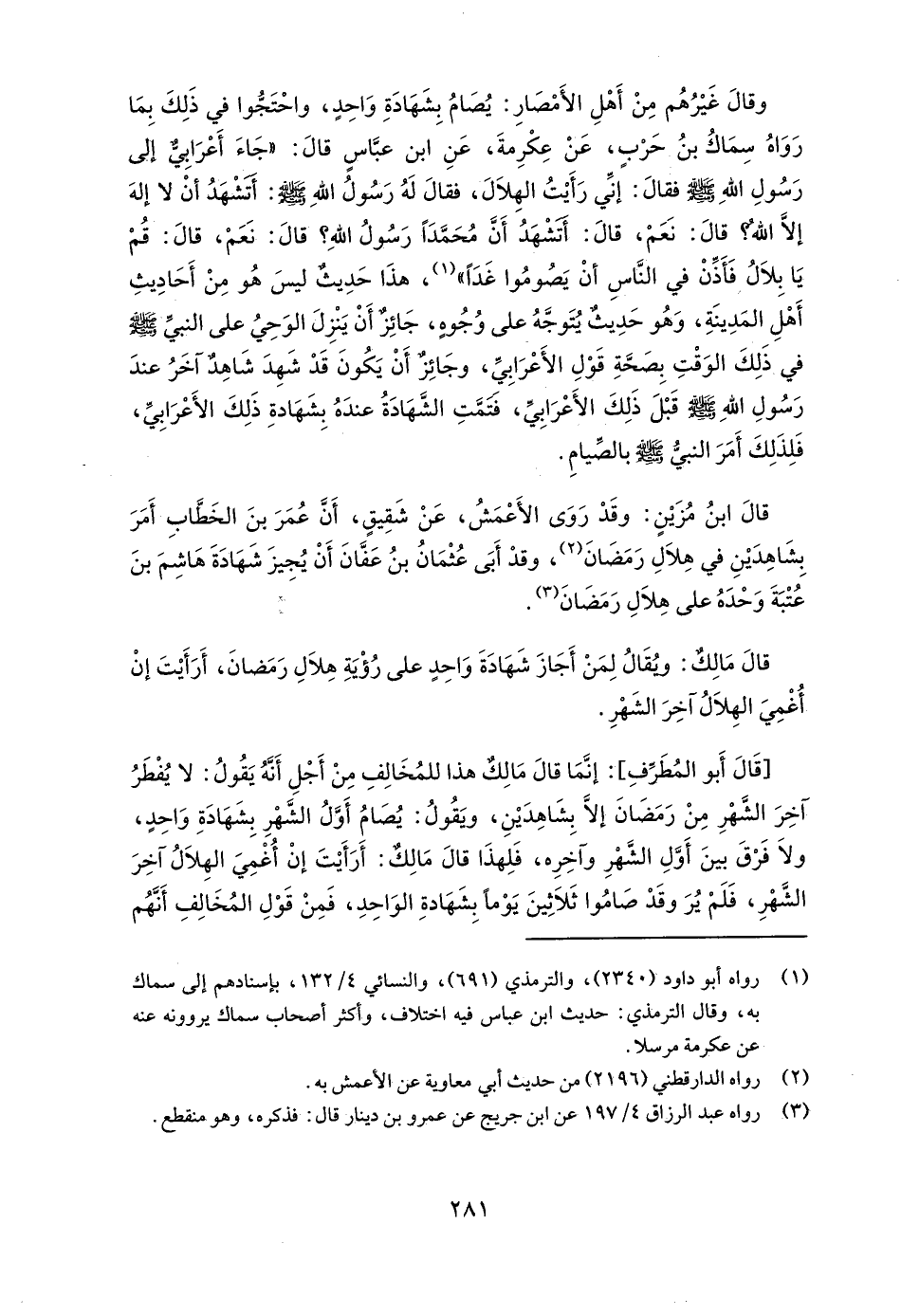 وقالَ غَيْرُهُم مِنْ أَهْلِ الأَمْصَارِ: يُصَامُ بِشَهَادَةِ وَاحِدٍ، واحْتَجّوا في ذَلِكَ بِمَا رَوَاهُ سِمَاكُ بنُ حَرْبٍ، عَنْ عِكْرِمةَ، عَنِ ابن عبَّاسٍ قالَ: "جَاءَ أَعْرَابِيٌّ إلى رَسُولِ اللهِ - صلى الله عليه وسلم - فقالَ: إني رَأَيْتُ الهِلاَلَ، فقالَ لَهُ رَسُولُ اللهِ - صلى الله عليه وسلم -: أَتَشْهَدُ أنْ لا إلهَ إلَّا الله؟ قالَ: نَعَمْ، قالَ: أَتَشْهَدُ أَنَّ مُحَمَّدَاً رَسُولُ اللهِ؟ قالَ: نَعَمْ، قالَ: قُمْ يا بِلاَلُ فَأَذِّنْ في النَّاسِ أنْ يَصُومُوا غَدَاً" (¬1)، هذَا حَدِيثٌ ليسَ هُو مِنْ أَحَادِيثِ أَهْلِ المَدِينَةِ، وَهُو حَدِيثٌ يُتَوجَّهُ على وُجُوهٍ، جَائِزٌ أَنْ يَنْزِلَ الوَحِيُ على النبيِّ - صلى الله عليه وسلم - في ذَلِكَ الوَقْتِ بِصَحَّةِ قَوْلِ الأَعْرَابِيِّ، وجَائِز أَنْ يَكُونَ قَدْ شَهِدَ شَاهِدٌ آخَرُ عندَ رَسُولِ اللهِ - صلى الله عليه وسلم - قَبْلَ ذَلِكَ الأَعْرَابِيِّ، فَتَمَّتِ الشَّهَادَةُ عندَهُ بِشَهَادةِ ذَلِكَ الأَعْرَابِيِّ، فَلِذَلِكَ أَمَرَ النبيُّ - صلى الله عليه وسلم - بالصِّيامِ.