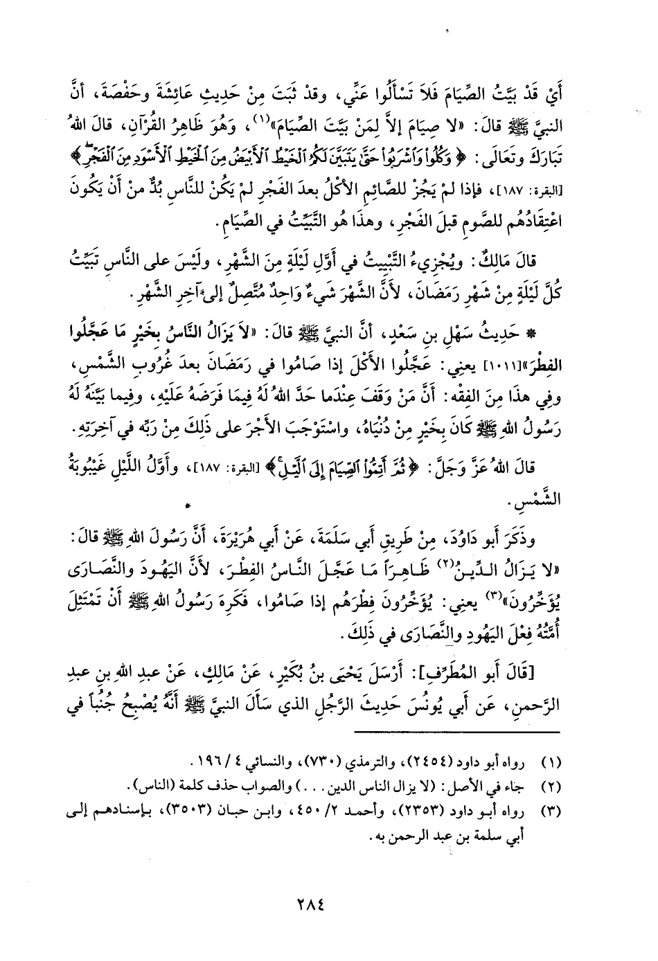 وذَكَرَ أَبو دَاوُدَ، مِنْ طَرِيقِ أَبي سَلَمَةَ، عَنْ أَبي هُرَيْرَةَ، أَنَّ رَسُولَ اللهِ - صلى الله عليه وسلم - قالَ: "لا يَزَالُ الدّينُ (¬2) ظَاهِرًا مَا عَجَّلَ النَّاسُ الفِطْرَ، لأَنَّ اليَهُودَ والنَّصَارَى يُؤَخّرُونَ" (¬3) يعنِي: يُؤَخِّرُونَ فِطْرَهُم إذا صَامُوا، فَكَرِهَ رَسُولُ اللهِ - صلى الله عليه وسلم - أَنْ تَمْتَثِلَ أُمَّتُهُ فِعْلَ اليَهُودِ والنَّصَارَى في ذَلِكَ.