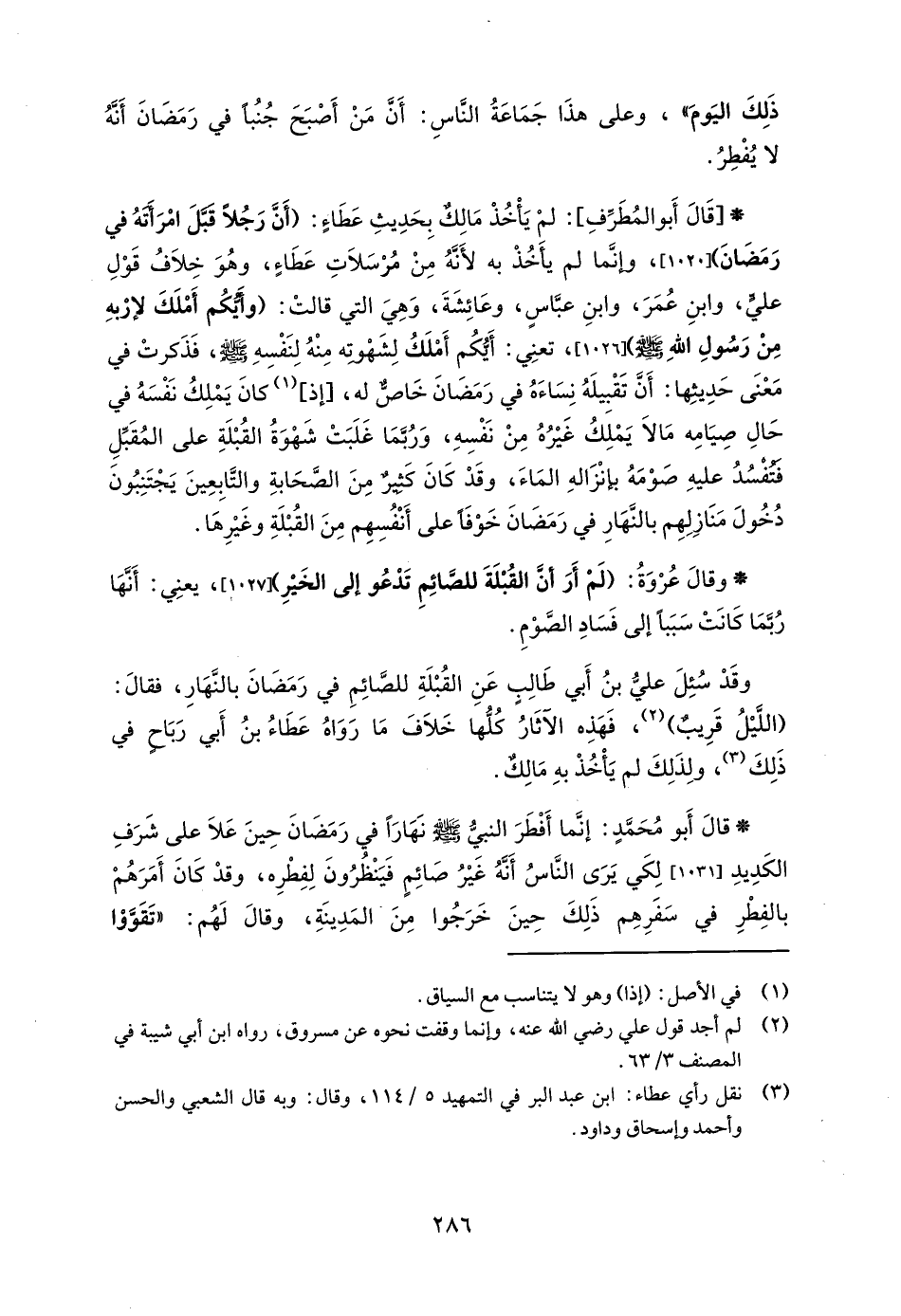 * [قَالَ أَبوالمُطَرِّفِ]: لمْ يَأْخُذْ مَالِكٌ بِحَدِيثِ عَطَاءٍ: (أَنَّ رَجُلاً قبَّلَ امْرَأَتهُ في رَمَضَانَ) [1020]، وإنَّما لم يأَخُذْ به لأَنَّهُ مِنْ مُرْسَلاَتِ عَطَاءٍ، وهُوَ خِلاَفُ قَوْلِ علي، وابنِ عُمَرَ، وابنِ عبَّاسٍ، وعَائِشَةَ، وَهِيَ التي قالتْ: (وأَيُّكُم أَمْلَكَ لإرْبهِ مِنْ رَسُولِ اللهِ - صلى الله عليه وسلم -) [1026]، تعنِي: أَيُّكُم أَمْلَكُ لِشَهْوتِه مِنْهُ لِنَفْسِهِ - صلى الله عليه وسلم -، فَذَكرتْ في مَعْنَى حَدِيثِها: أَنَّ تَقْبيلَهُ نِسَاءَهُ في رَمَضَانَ خَاصٌ له، [إذ] (¬1) كانَ يَمْلِكُ نَفْسَهُ في حَالِ صِيَامِه مَا لَا يَمْلِكُ غَيْرُهُ مِنْ نَفْسِهِ، وَرُبَّمَا غَلَبَتْ شَهْوَةُ القُبْلَةِ على المُقَبّلِ فتفسُدُ عليهِ صَوْمَهُ بإنْزَالهِ المَاءَ، وقَدْ كَانَ كَثيرٌ مِنَ الصَّحَابةِ والتَّابِعِينَ يَجْتَنِبُونَ دُخُولَ مَنَازِلِهِم بالنَّهَارِ في رَمَضَانَ خَوْفًا على أَنْفُسِهِم مِنَ القُبْلَةِ وغَيْرِهَا.