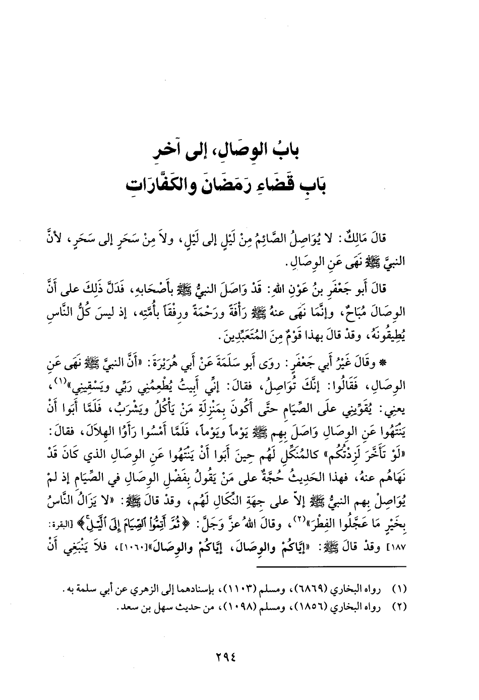 قالَ مَالِكٌ: لا يُوَاصِلُ الصَّائِمُ مِنْ لَيْلٍ إلى لَيْلٍ، ولَا مِنْ سَحَرٍ إلى سَحَرٍ، لأنَّ النبيَّ - صلى الله عليه وسلم - نَهَى عَنِ الوِصَالِ.