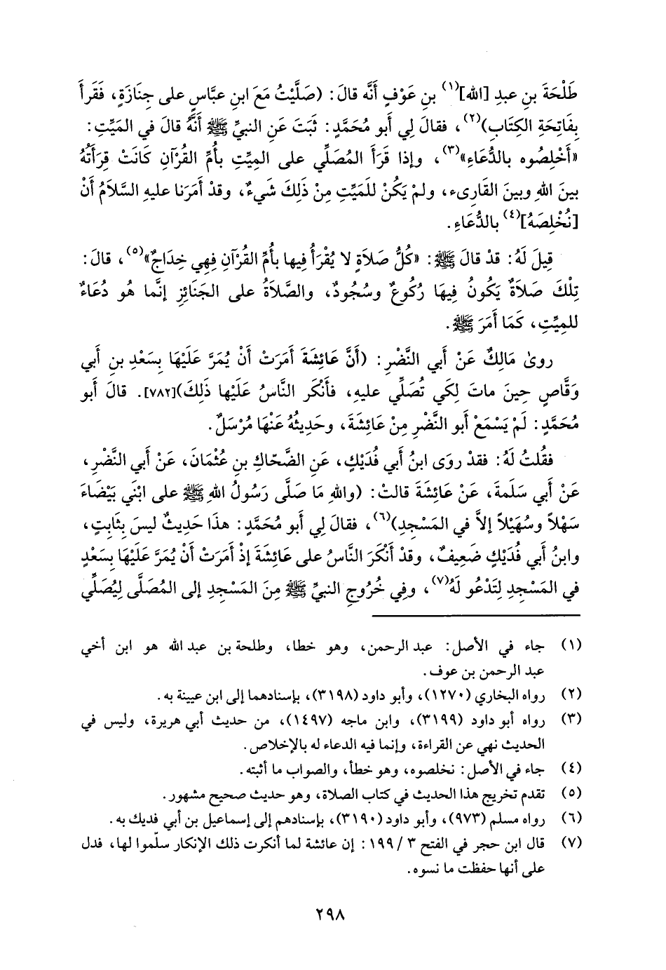 روى مَالِكٌ عَنْ أَبي النَّضْرِ: (أَنَّ عَائِشَةَ أَمَرَتْ أَنْ يُمَرَّ عَلَيْهَا بِسَعْدِ بنِ أَبي وَقَّاصٍ حِينَ ماتَ لِكَي تُصَلِّي عليهِ، فأَنْكَر النَّاسُ عَلَيْها ذَلِكَ) [782]. قالَ أَبو مُحَمَّدٍ: لَمْ يَسْمَعْ أَبو النَّضْرِ مِنْ عَائِشَةَ، وحَدِيثُهُ عَنْهَا مُرْسَلٌ.
