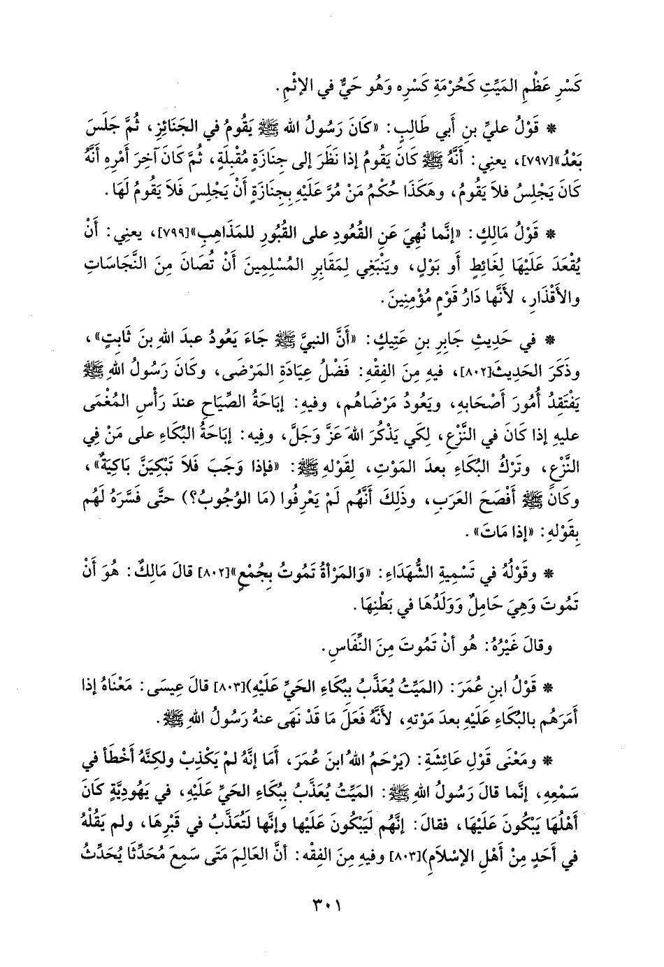* قَوْلُ عليِّ بنِ أَبي طَالِبٍ: "كَانَ رَسُولُ الله - صلى الله عليه وسلم - يَقُومُ في الجَنَائِزِ، ثُمَّ جَلَسَ بَعْدُ" [797]، يعنِي: أَنَّهُ - صلى الله عليه وسلم - كَانَ يَقُومُ إذا نَظَرَ إِلَى جِنَازَةٍ مُقْبلَةٍ، ثُمَّ كَانَ آخِرَ أَمْرِهِ أَنَّهُ كَانَ يَجْلِسُ فلَا يَقُومُ، وهَكَذَا حُكْمُ مَنْ مُزَ عَلَيْهِ بِجِنَازَةٍ أَنْ يَجْلِسَ فَلَا يَقُومُ لَهَا.