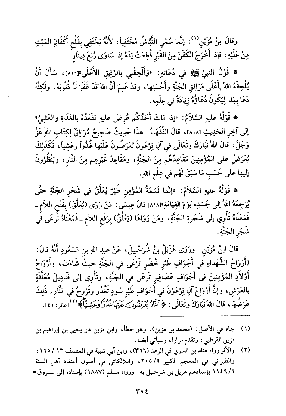 * قَوْلُهُ - عليهِ السَّلَامُ -: "إذا مَاتَ أَحَدُكم عُرِضَ عليهِ مَقْعَدُهُ بالغَدَاةِ والعَشِيِّ" إلى آخِرِ الحَدِيثِ [818]، قالَ الفُقَهَاءُ: هذَا حَدِيثٌ صَحِيحٌ مُوَافِقٌ لِكِتَاب اللهِ -عَزَّ وَجَلَّ-، قالَ اللهُ تَبَارَكَ وتَعَالَى في آلِ فِرْعَونَ يُعْرَضُونَ عَلَيْها غُدُّوًا وعَشِيًا، فَكَذَلِكَ يُعْرَضُ على المُؤْمِنِينَ مَقَاعِدُهم مِنَ الجَنَّةِ، ومَقَاعِدُ غَيْرِهِم مِنَ النَّارِ، ويَنْظُرُونَ إليها على حَسَبِ مَا سبَتقَ لَهُم في عِلْمِ اللهِ.