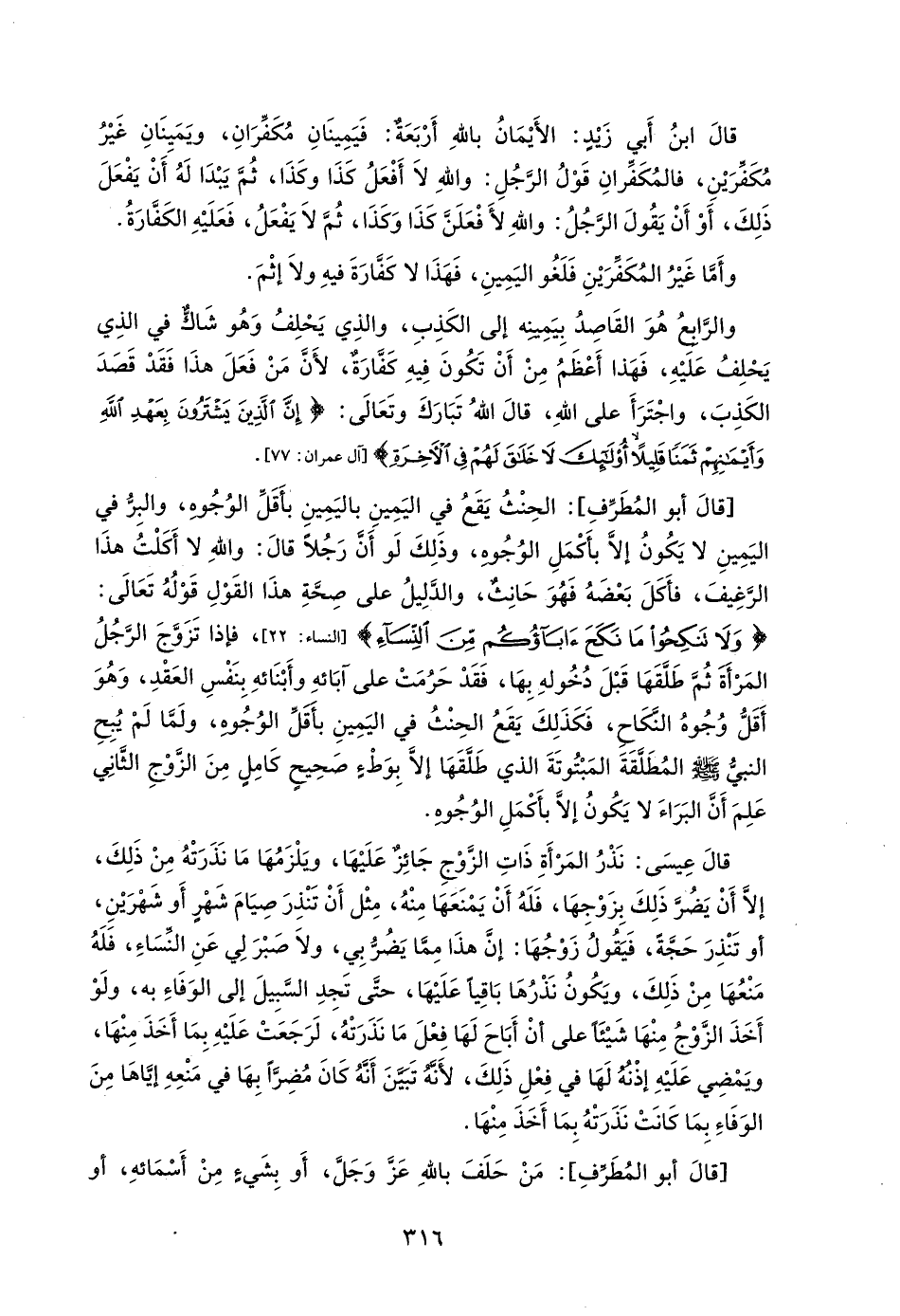 [قالَ أبو المُطَرِّفِ]: الحِنْثُ يَقَعُ في اليَمِينِ باليَمِينِ بِأَقَلِّ الوُجُوهِ، والبِرُّ في اليَمِينِ لا يَكُونُ إلَّا بأَكْمَلِ الوُجُوهِ، وذَلِكَ لَو أَنَّ رَجُلًا قالَ: واللهِ لا أَكَلْتُ هذَا الرَّغِيفَ، فأَكَلَ بَعْضَهُ فَهُوَ حَانِثٌ، والدَّلِيلُ على صِحَّةِ هذَا القَوْلِ قَوْلُهُ تَعَالَى: {وَلَا تَنْكِحُوا مَا نَكَحَ آبَاؤُكُمْ مِنَ النِّسَاءِ} [النساء: 22]، فإذا تَزَوَّجَ الرَّجُلُ المَرْأَةَ ثم طَلَّقَهَا قَبْلَ دُخُولهِ بِهَا، فقَدْ حَرُمَتْ على آبَائهِ وأَبْنَائهِ بِنَفْسِ العَقْدِ، وَهُوَ أَقَلُّ وُجُوهُ النَّكَاحِ، فَكذَلِكَ يَقَعُ الحِنْثُ في اليَمِينِ بِأَقَلِّ الوُجُوهِ، ولَمَّا لَمْ يُبِحِ النبيُّ - صلى الله عليه وسلم - المُطَلَّقَةَ المَبْتُوتَةَ الذي طَلَّقَهَا إلَّا بِوَطْءِ صَحِيع كَامِل مِنَ الزَّوْجِ الثَّانِي عَلِمَ أَنَّ البَرَاءَ لا يَكُونُ إلَّا بِأَكْمَلِ الوُجُوهِ.