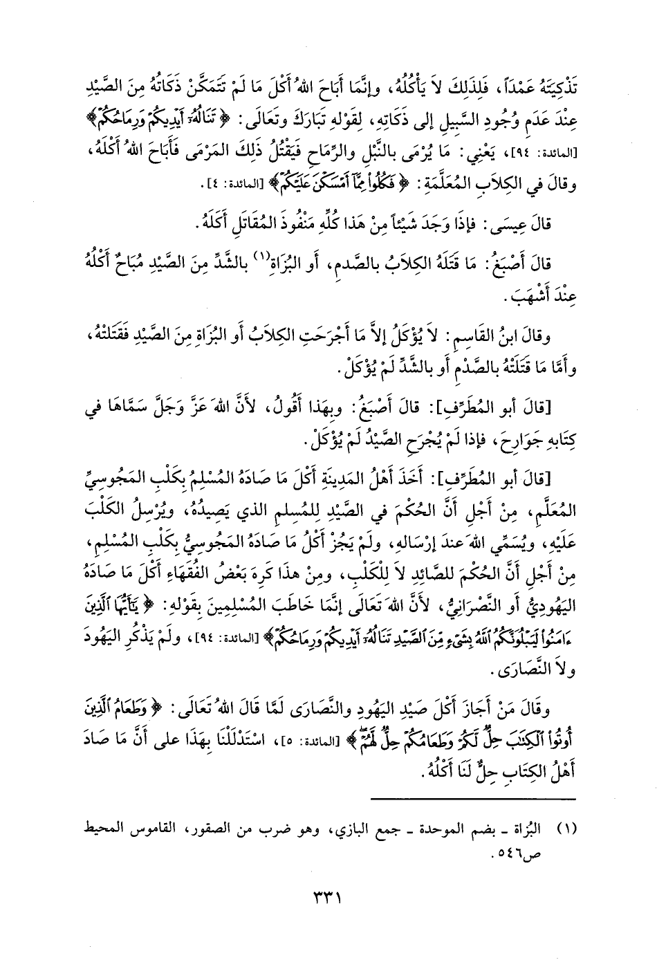 [قالَ أبو المُطَرِّفِ]: أَخَذَ أَهْلُ المَدِينَةِ أَكْلَ مَا صَادَهُ المُسْلِمُ بِكَلْبِ المَجُوسِيِّ المُعَلَّمِ، مِنْ أَجْلِ أَنَّ الحُكْمَ في الصَّيْدِ لِلمُسِلمِ الذي يَصِيدُهُ، وُيرْسِلُ الكَلْبَ عَلَيْهِ، ويُسَمِّي اللهَ عندَ إرْسَالهِ، ولَمْ يَجُزْ أَكْلُ مَا صَادَهُ المَجُوسِيُّ بِكَلْبِ المُسْلِمِ، مِنْ أَجْلِ أَنَّ الحُكْمَ للصَّائِدِ لَا لِلْكَلْبِ، ومِنْ هذَا كَرِهَ بَعْضُ الفُقَهَاءِ أَكْلَ مَا صَادَهُ اليَهُودِيُّ أَو النَّصْرَانِيُّ، لأَنَّ اللهَ تَعَالَى إنَّمَا خَاطَبَ المُسْلِمِينَ بِقَوْلهِ: {يَاأَيُّهَا الَّذِينَ آمَنُوا لَيَبْلُوَنَّكُمُ اللَّهُ بِشَيْءٍ مِنَ الصَّيْدِ تَنَالُهُ أَيْدِيكُمْ وَرِمَاحُكُمْ} [المائدة: 94]، ولَمْ يَذْكُرِ اليَهُودَ ولَا النَصَارَى.