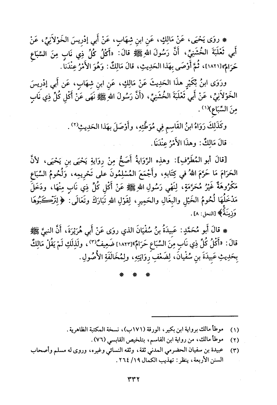 * روَى يحيى، عَنْ مَالِكٍ، عَنِ ابنِ شِهَابٍ، عَنْ أَبي إدْرِيسَ الخَوْلَانِي، عَنْ أَبي ثَعْلَبَةَ الخُشَنِيِّ، أَنَّ رَسُولَ اللهِ - صلى الله عليه وسلم - قالَ: "أَكْلُ كُلِّ ذِي نَابٍ مِنَ السِّبَاعِ حَرَامٌ" [1821]، ثُمَّ أَوْصَى بِهَذا الحَدِيثِ، قالَ مَالِكٌ: وَهُوَ الأَمْرُ عِنْدَنا.