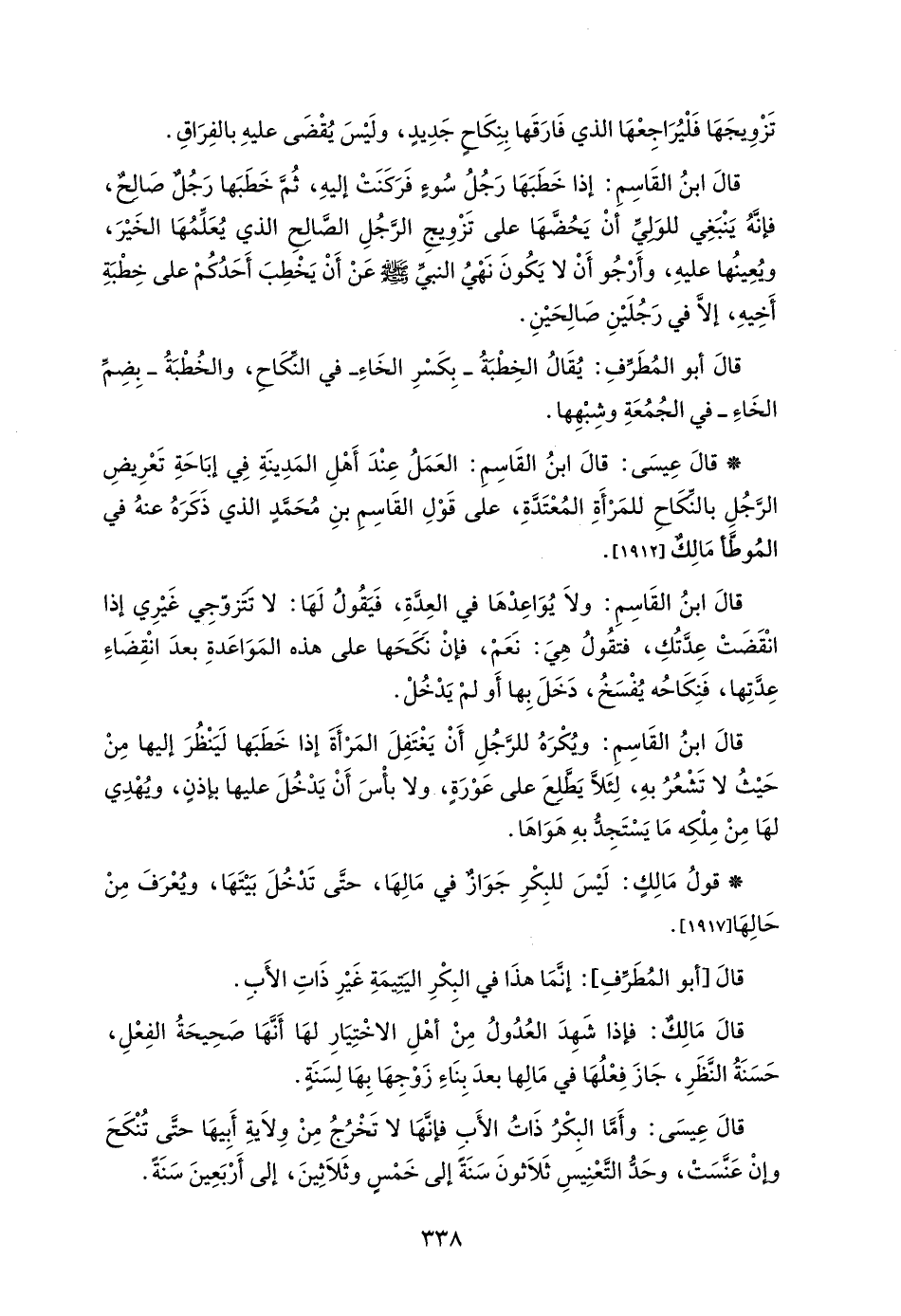 * قالَ عِيسَى: قالَ ابنُ القَاسِمِ: العَمَلُ عِنْدَ أَهْلِ المَدِينَةِ في إبَاحَةِ تَعْرِيضِ الرَّجُلِ بالنِّكَاحِ للمَرْأَةِ المُعْتَدَّةِ، على قَوْلِ القَاسِمِ بنِ مُحَمَّدٍ الذي ذَكَرَهُ عنهُ في المُوطَّأَ مَالِكٌ [1912].