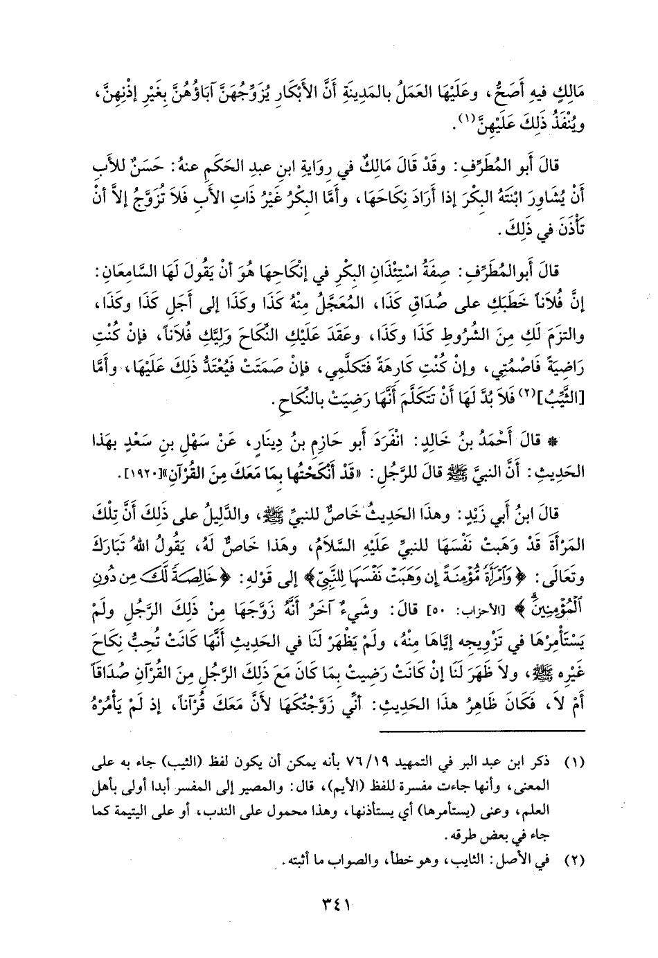 (¬1) ذكر ابن عبد البر في التمهيد 76/ 19 بأنه يمكن أن يكون لفظ (الثيب) جاء به على المعنى، وأنها جاءت مفسرة للفظ (الأيم)، قال: والمصير إلى التفسر أبدا أولى بأهل العلم، وعنى (يستأمرها) أي يستأذنها، وهذا محمول على الندب، أو على اليتيمة كما جاء في بعض طرقه.