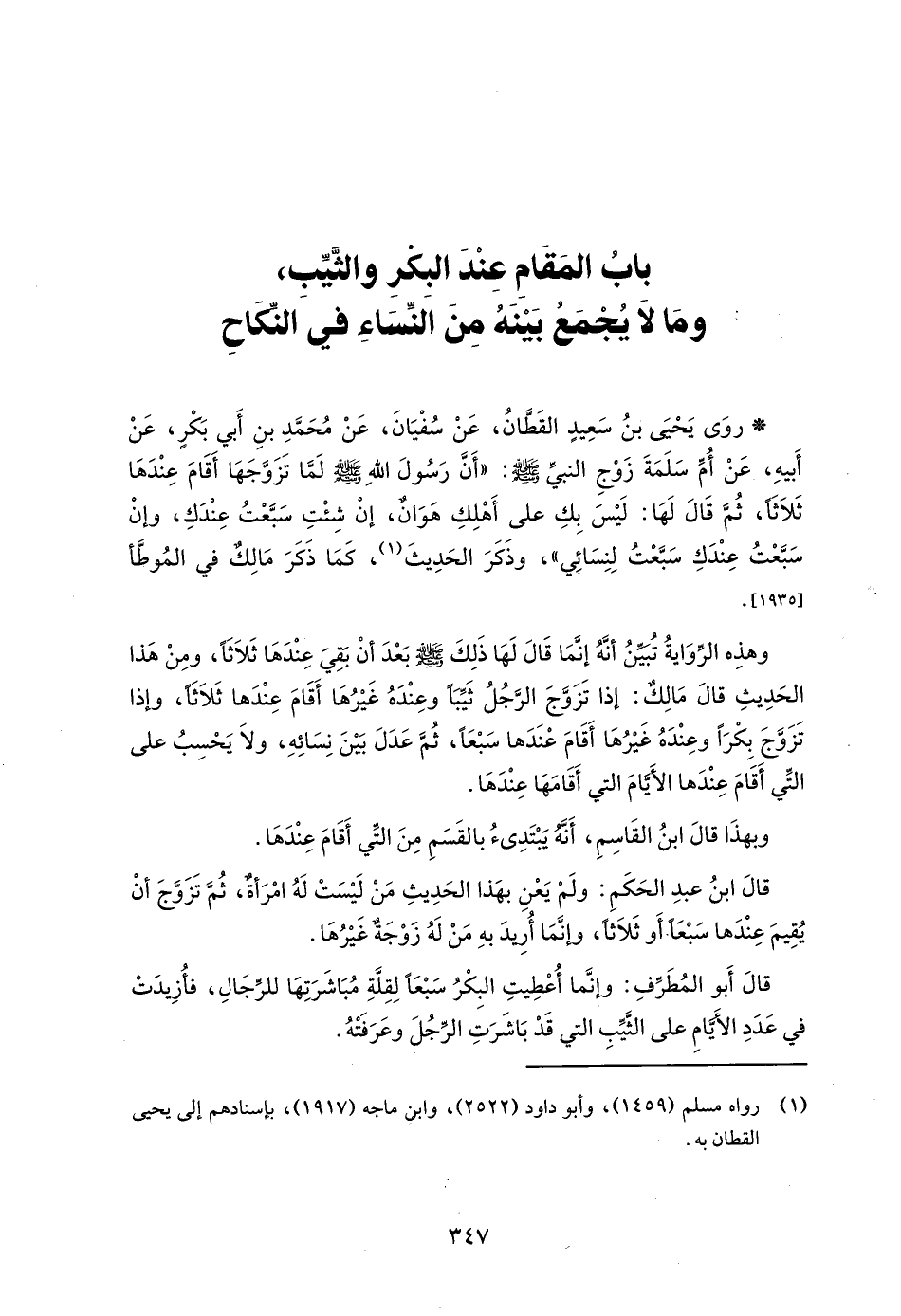 * روَى يحيى بنُ سَعِيدٍ القَطَّانُ، عَنْ سُفْيَانَ، عَنْ مُحَمَّدِ بنِ أَبي بَكْرٍ، عَنْ أَبيهِ، عَنْ أُمِّ سَلَمَةَ زَوْجِ النبيِّ - صلى الله عليه وسلم -: "أَنَّ رَسُولَ اللهِ - صلى الله عليه وسلم - لمَّا تَزَوَّجَهَا أَقَامَ عِنْدَهَا ثَلَاثًا، ثُمَّ قَالَ لَهَا: لَيْسَ بِكِ على أَهْلِكِ هَوَانٌ، إنْ شِئْتِ سَبَّعْتُ عِنْدَكِ، وإنْ سَبَّعْتُ عِنْدَكِ سَبَّعْتُ لِنِسَائِي"، وذَكَرَ الحَدِيثَ (¬1)، كَمَا ذَكَرَ مَالِكٌ في المُوطَّأ [1935].