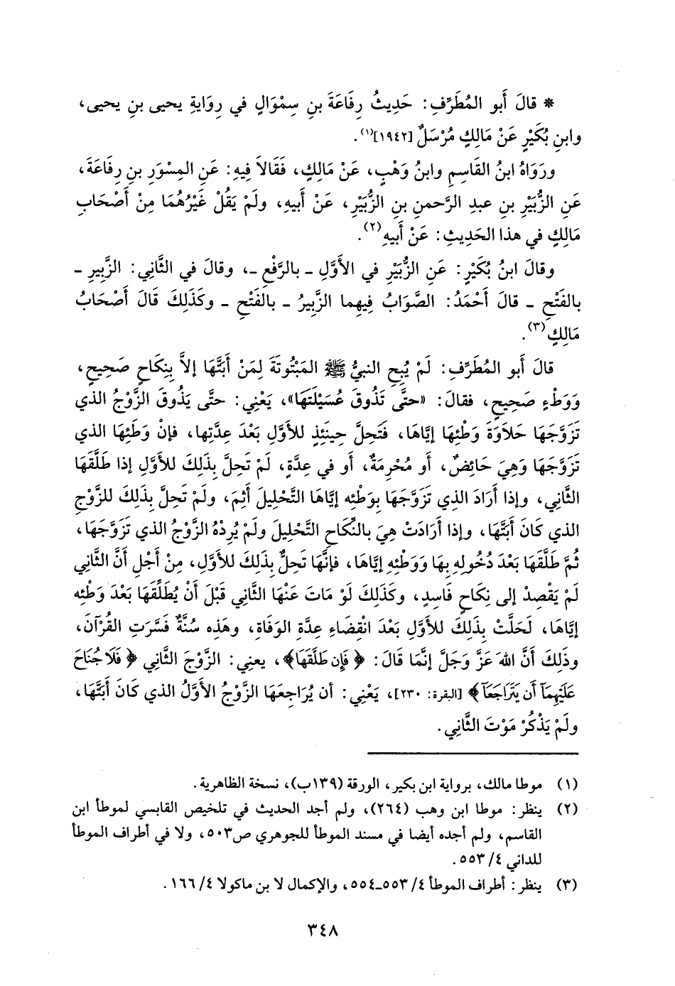 قالَ أَبو المُطَرِّفِ: لَمْ يُبِحِ النبيُّ المَبْتُوتَةَ لِمَنْ أَبَتَّهَا إلَّا بِنِكَاحٍ صَحِيحٍ، وَوَطْءٍ صَحِيحٍ، فقالَ: "حتَّى تَذُوقَ عُسَيلَتَهَا"، يَعْنِي: حتَّى يَذُوقَ الزَّوْجُ الذي تَزَوَّجَهَا حَلَاوَةَ وَطْئِهَا إيَّاهَا، فتَحِل حِينَئِذٍ للأَوَّلِ بَعْدَ عِدَّتِها، فإنْ وَطَئِهَا الذي تَزَوَّجَهَا وَهِيَ حَائِضٌّ، أَو مُحْرِمَةٌ، أَوفي عِدَّةٍ، لَمْ تَحِلَّ بِذَلِكَ للأَوَّلِ إذا طَلَّقَهَا الثَّانِي، وإذا أَرَادَ الذِي تَزَوَّجَهَا بِوَطْئِه إيَّاهَا التَحْلِيلَ أَثِمَ، ولَمْ تَحِلَّ بِذَلِكَ للزَّوْجِ الذي كَانَ أَبَتَّهَا، وإذا أَرَادَتْ هِيَ بالنِّكَاحِ التَّحْلِيلَ ولَمْ يُرِدْهُ الزَّوْجُ الذي تَزَوَّجَهَا، ثُمَّ طَلَّقَهَا بَعْدَ دُخُولِهِ بِهَا وَوَطْئِهِ إيَّاهَا، فإِنَّهَا تَحِلّ بِذَلِكَ للأَوَّلِ، مِنْ أَجْلِ أَنَّ الثَّانِي لَمْ يَقْصِدْ إلى نِكَاحٍ فَاسِدِ، وكَذَلِكَ لَوْ مَاتَ عَنْهَا الثَّانِي قَبْلَ أَنْ يُطَلِّقَهَا بَعْدَ وَطْئِه إيَّاهَا، لَحَلَّتْ بِذَلِكَ للأَوَّلِ بَعْدَ انْقِضَاءِ عِدَّةِ الوَفَاةِ، وهَذِه سُنَّةٌ فَسَّرَتِ القُرْآنَ، وذَلِكَ أَنَّ اللهَ -عَزَّ وَجَلَّ- إنَّمَا قَالَ: {فَإِنْ طَلَّقَهَا} يعنِي: الزَّوْجَ الثَّانِي} فَلَا جُنَاحَ عَلَيَهمَا أَنْ يَتَرَاجَعَا} [البفرة: 230]، يَعْنِي: أن يُرَاجِعَهَا الزَّوْجُ الأَوَّلُ الذي كَانَ أَبَتَّهَا، ولَمْ يَذْكُرْ مَوْتَ الثَّانِي.