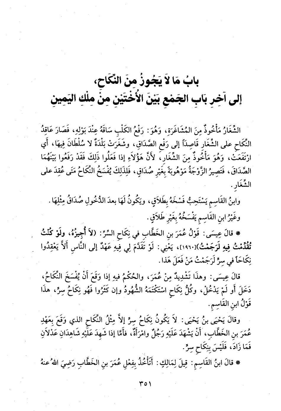 * قالَ عِيسَى: قَوْلُ عُمَرَ بنِ الخَطَّابِ في نِكَاحِ السِّرِّ: "لَا أُجِيزُهُ، ولَوْ كُنْتُ تُقُدِّمْتُ فِيهِ لَرَجَمْتُ) [1960]، يَعْنِي: لَوْ تَقَدَّمَ لِي فِيهِ عَهْدٌ إلى النَّاسِ أَلَّا يَعْقِدُوا نِكَاحًا في سِرٍّ لَرَجَمْتُ مَنْ فَعَلَ هَذا.