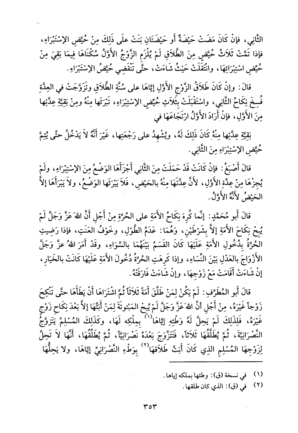 قالَ أَبو المُطَرِّفِ: لَمْ يَكُنْ لِمَنْ طَلَّقَ أَمَةً ثَلاَثَا ثُمَّ اشْتَرَاهَا أَنْ يَطَأَهَا حتَّى تَنْكِحَ زَوْجًا غَيْرَهُ، مِنْ أَجْلِ أنَّ الله -عَزَّ وَجَلَّ- لَمْ يُبِحْ المَبْتوتَةَ لِمَنْ أَبَتَّهَا إلَّا بَعْدَ نِكَاحِ زَوْجٍ غَيْرَهُ، فَلِذَلِكَ لَمْ يَحِلَّ لَهُ وَطْئِهِ إيَّاهَا (¬1) بِمِلْكِه لَهَا، وكَذَلِكَ المُسْلِمُ يَتَزوَّجُ النَّصْرَانِيَّةَ، ثُمَّ يُطَلَّقُهَا ثَلاَثًا، فَتَتَزَّوَجَ بَعْدَهُ نَصْرَانِيَّاً، ثُمَّ يُطَلِّقُهَا، أَنَّهَا لَا تَحِلَّ لِزَوْجِهَا المُسْلِمِ الذِي كَانَ أَبَتَّ طَلاَقهَا (¬2) بِوَطْءِ النَّصْرَانِيِّ إيَّاهَا، ولا يَحِلُّهَا