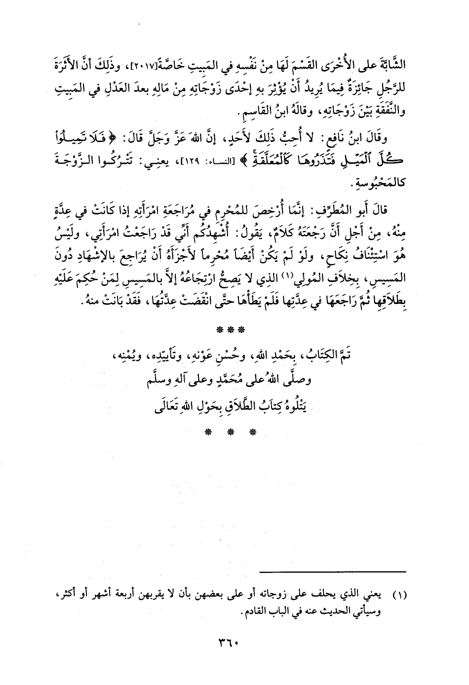 وقَالَ ابنُ نَافِعٍ: لا أُحِبُّ ذَلِكَ لأَحَدٍ، إنَّ اللهَ -عَزَّ وَجَلَّ- قَالَ: {فَلَا تَمِيلُوا كُلَّ الْمَيْلِ فَتَذَرُوهَا كَالْمُعَلَّقَةِ} [النساء: 129]، يعنِي: تَتْرُكُوا الزَّوْجَةَ كالمَحْبُوسةِ.