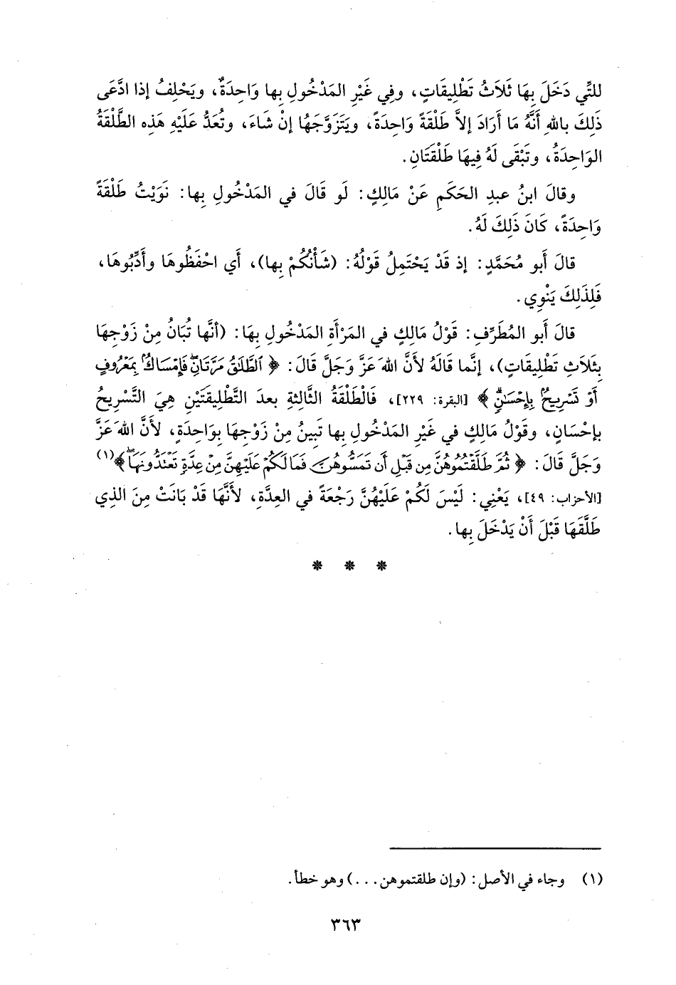 قالَ أَبو المُطَرِّفِ: قَوْلُ مَالِكٍ في المَرْأَةِ المَدْخُولِ بِهَا: (أنَّها تُبَانُ مِنْ زَوْجِهَا بِثَلاَثِ تَطْلِيقَاتٍ)، إنَّما قَالَهُ لأَنَّ اللهَ -عَزَّ وَجَلَّ- قَالَ: {الطَّلَاقُ مَرَّتَانِ فَإِمْسَاكٌ بِمَعْرُوفٍ أَوْ تَسْرِيحٌ بِإِحْسَانٍ} [البقرة: 229]، فَالْطَلْقَةُ الثَّالِثةِ بعدَ التَّطْلِيقتيْنِ هِيَ التَّسْرِيحُ بإحْسَانٍ، وقَوْلُ مَالِكٍ في غَيْرِ المَدْخُولِ بِها تَبِينُ مِنْ زَوْجِهَا بِوَاحِدَةٍ، لأَنَّ اللهَ -عَزَّ وَجَلَّ- قَالَ: {ثُمَّ طَلَّقْتُمُوهُنَّ مِنْ قَبْلِ أَنْ تَمَسُّوهُنَّ فَمَا لَكُمْ عَلَيْهِنَّ مِنْ عِدَّةٍ تَعْتَدُّونَهَا} (¬1) [الأحزاب: 49]، يَعْنِي: لَيْسَ لَكُمْ عَلَيْهُنَّ رَجْعَةً في العِدَّةِ، لأَنَّهَا قَدْ بَانَتْ مِنَ الذِي طَلَّقَهَا قَبْلَ أَنْ يَدْخَلَ بِها.