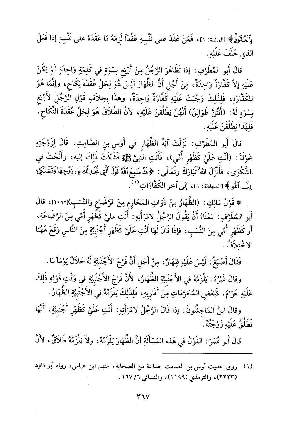 قالَ أَبو المُطَرِّفِ: إذا تَظَاهَرَ الرَّجُلُ مِنْ أَرْبَعِ نِسْوَةٍ في كَلِمَةٍ وَاحِدَةٍ لَمْ يَكُنْ عَلَيْهِ إلَّا كَفَّارَةٌ وَاحِدَةٌ، مِنْ أَجْلِ أَنَّ الظِّهَارَ لَيْسَ هُوَ لِحَلِّ عُقْدَةَ نِكَاحٍ، وإنَّمَا هُوَ للكَفَّارَةِ، فَلِذَلِكَ وَجَبَتْ عَلَيْهِ كَفَّارَةٌ وَاحِدَةٌ، وهذَا بِخِلاَفِ قَوْلِ الرَّجُلِ لأَرْبَعِ نِسْوَةٍ لَهُ: (أَنْتُنَّ طَوَالِقُ) أَنَّهُنَّ يَطْلُقْنَ عَلَيْهِ، لأن الطَّلاَقَ هُوَ لِحَلِّ عُقْدَةَ النِّكَاحِ، فَلِهَذا يَطْلُقَنَ عَلَيْهِ.