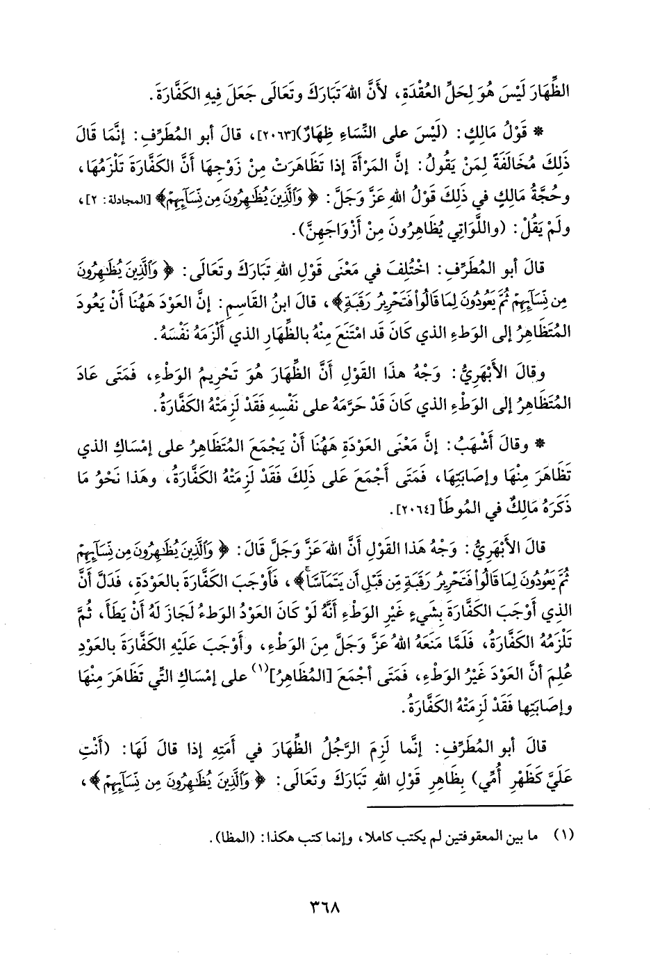 قالَ أبو المُطَرِّفِ: اخْتُلِفَ في مَعْنَى قَوْلِ اللهِ تَبَارَكَ وتَعَالَى: {وَالَّذِينَ يُظَاهِرُونَ مِنْ نِسَائِهِمْ ثُمَّ يَعُودُونَ لِمَا قَالُوا فَتَحْرِيرُ رَقَبَةٍ}، قالَ ابنُ القَاسِمِ: إنَّ العَوْدَ هَهُنَا أَنْ يَعُودَ المُتَظَاهِرُ إلى الوَطءِ الذي كَانَ قَد امْتَنَعَ مِنْهُ بالظِّهَارِ الذي أَلْزَمَهُ نَفْسَهُ.