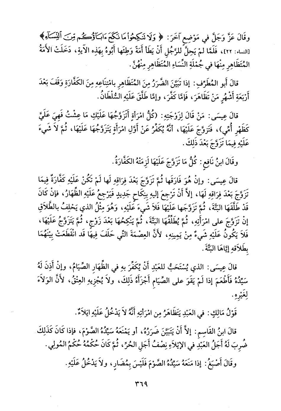وقَالَ -عَزَّ وَجَلَّ- في مَوْضِعٍ آخَرَ: {وَلَا تَنْكِحُوا مَا نَكَحَ آبَاؤُكُمْ مِنَ النِّسَاءِ} [النساء: 22]، فَلَمَّا لَمْ يَحِلَّ للرَّجُلِ أَنْ يَطَأ أَمَةً وَطِئَها أَبُوهُ بِهَذِه الآيةِ، دَخَلَتْ الأَمَةُ المُتَظَاهِرِ مِنْهَا في جُمْلَةِ النِّسَاءِ المُتَظَاهِرِ مِنْهُنَّ.