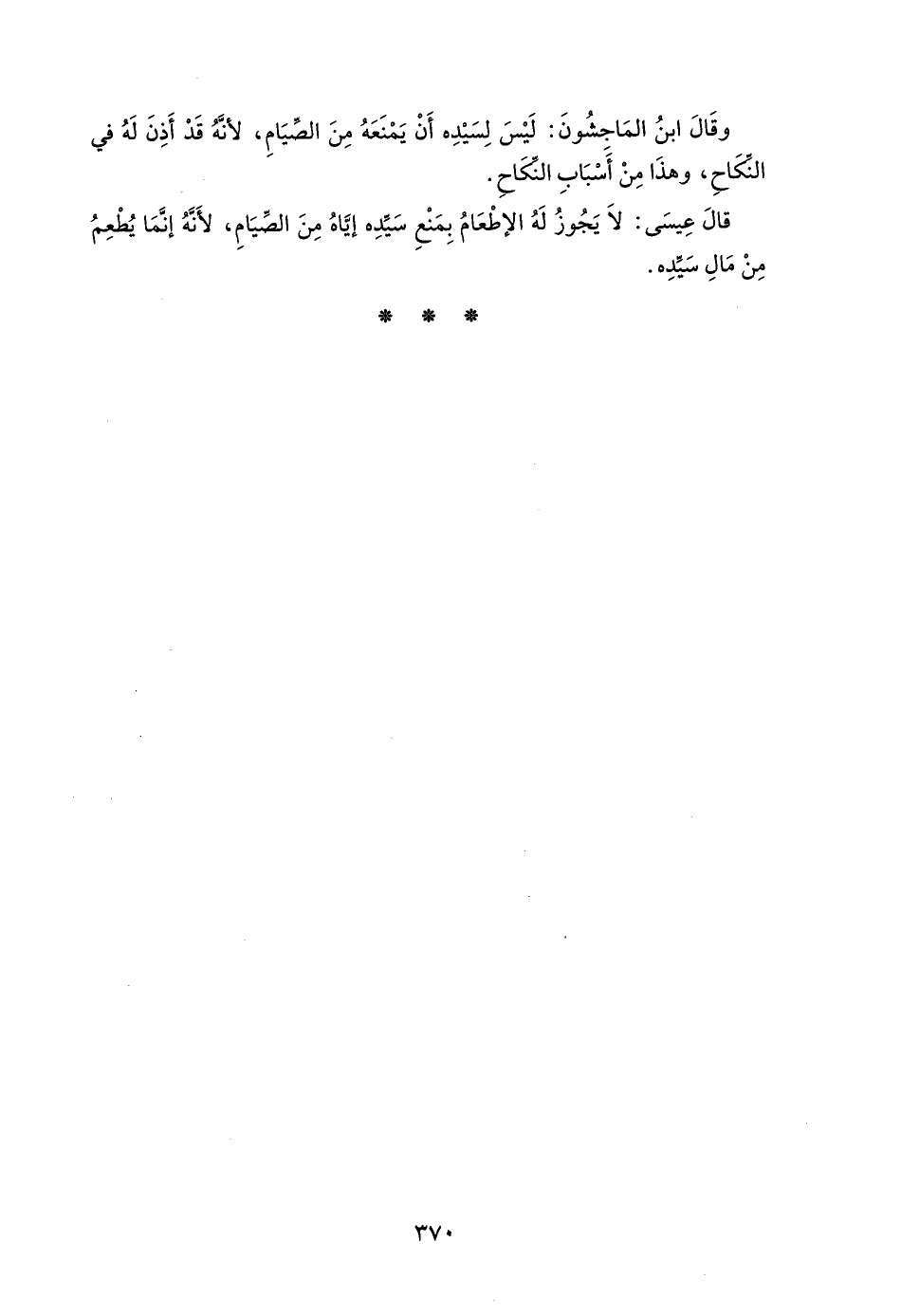 وقَالَ ابنُ المَاجشُونَ: لَيْسَ لِسَيْدِه أَنْ يَمْنَعَهُ مِنَ الصِّيَامِ، لأنَّهُ قَدْ أَذِنَ لَهُ في النِّكَاحِ، وهذَا مِنْ أَسْبَابِ النِّكَاحِ.