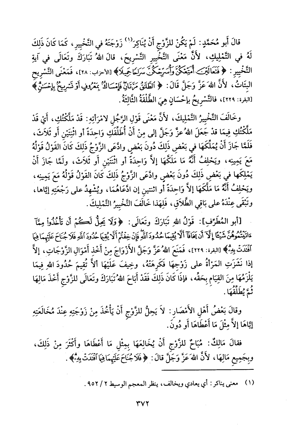 [أبو المُطَرِّفِ]: قَوْلُ اللهِ تَبَارَكَ وتَعَالَى: {وَلَا يَحِلُّ لَكُمْ أَنْ تَأْخُذُوا مِمَّا آتَيْتُمُوهُنَّ شَيْئًا إِلَّا أَنْ يَخَافَا أَلَّا يُقِيمَا حُدُودَ اللهِ فَإِنْ خِفْتُمْ أَلَّا يُقِيمَا حُدُودَ اللهِ فَلَا جُنَاحَ عَلَيْهِمَا فِيمَا افْتَدَتْ بِهِ} [البقرة: 229]، فَمَنَعَ اللهُ -عَزَّ وَجَلَّ- الأَزْوَاجَ مِنْ أَخْذِ أَمْوَالِ الزَّوْجَاتِ، إلَّا إذا نَشَزَتِ المَرْأةُ على زَوْجِهَا فَكَرِهَتْهُ، وخِيفَ عَلَيْهَا ألَّا تُقِيمَ حُدُودَ اللهِ فِيمَا يَلْزَمُهَا مِنَ القِيَامِ بِحَقِّه، فإذَا كَانَ ذَلِكَ فَقَدْ أَبَاحَ اللهُ تَبَارَكَ وتَعَالَى للزَّوْجِ أَخْذَ مَالِهَا ثُمَّ يُطَلِّقُهَا.