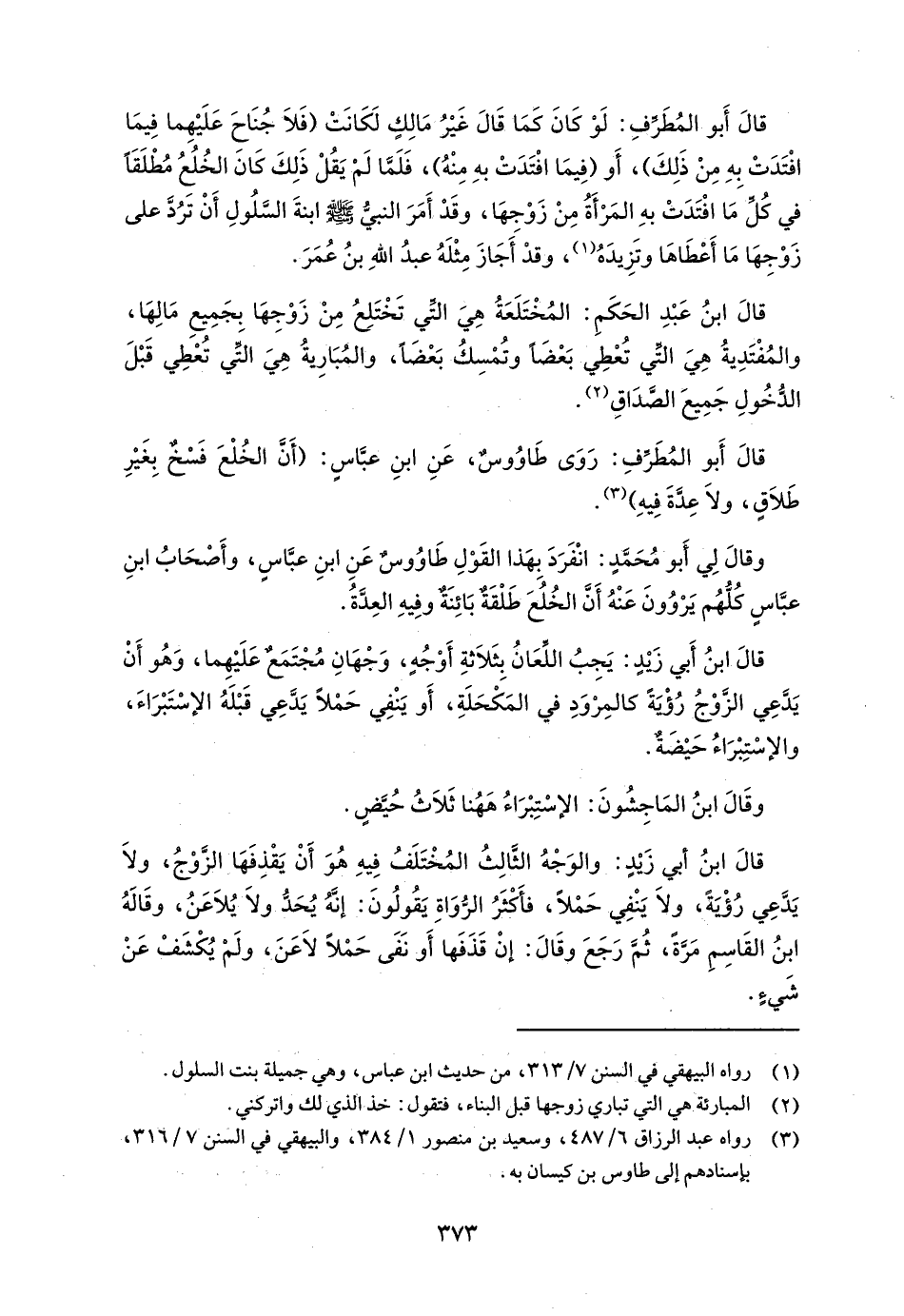 قالَ أَبو المُطَرِّفِ: لَوْ كَانَ كَمَا قَالَ غَيْرُ مَالِكٍ لَكَانَتْ (فَلَا جُنَاحَ عَلَيْهِما فِيمَا افْتَدَتْ بِهِ مِنْ ذَلِكَ)، أَو (فِيمَا افْتَدَتْ بهِ مِنْهُ)، فَلَمَّا لَمْ يَقُلْ ذَلِكَ كَانَ الخُلُعُ مُطْلَقَاً في كُلِّ مَا افْتَدَتْ بهِ المَرْأَةُ مِنْ زَوْجهَا، وقَدْ أَمَرَ النبيُّ - صلى الله عليه وسلم - ابنةَ السَّلُولِ أَنْ تَرُدَّ على زَوْجِهَا مَا أَعْطَاهَا وتَزِيدَهُ (¬1)، وقدْ أَجَازَ مِثْلَهُ عبدُ اللهِ بنُ عُمَرَ.