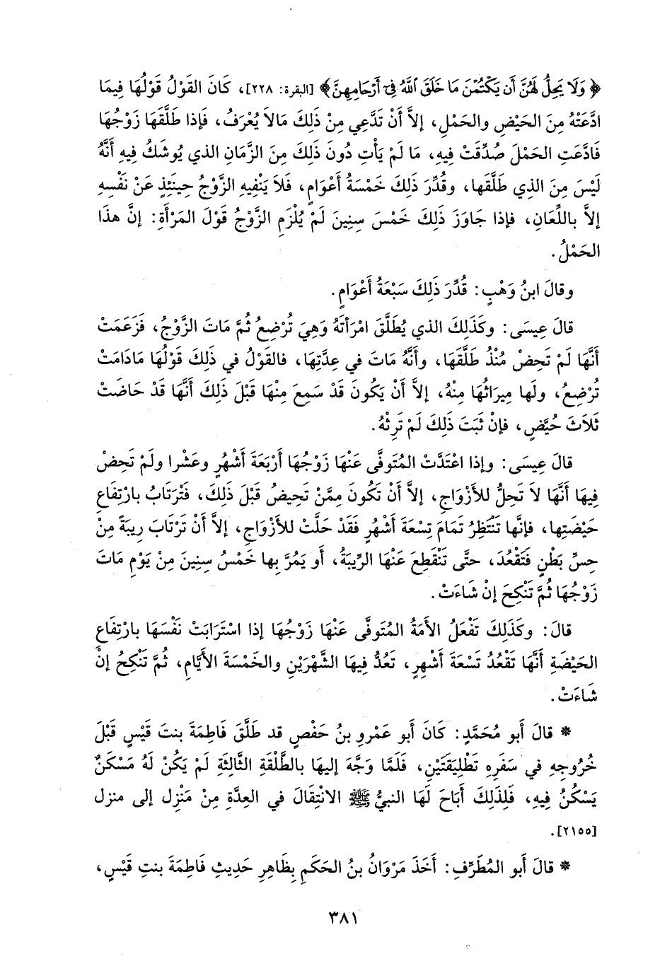 {وَلَا يَحِلُّ لَهُنَّ أَنْ يَكْتُمْنَ مَا خَلَقَ اللَّهُ فِي أَرْحَامِهِنَّ} [البقرة: 228]، كَانَ القَوْلُ قَوْلُهَا فِيمَا ادَّعَتْهُ مِنَ الحَيْضِ والحَمْلِ، إلَّا أَنْ تَدَّعِي مِنْ ذَلِكَ مَالاَ يُعْرَفُ، فَإذا طَلَّقَهَا زَوْجُهَا فَادَّعَتِ الحَمْلَ صُدِّقَتْ فِيهِ، مَا لَمْ يَأْتِ دُونَ ذَلِكَ مِنَ الزَّمَانِ الذي يُوشَكُ فِيهِ أَنَّهُ لَيْسَ مِنَ الذِي طَلَّقَها، وقُدِّرَ ذَلِكَ خَمْسَةُ أَعْوَامٍ، فَلَا يَنْفِيهِ الزَّوْجُ حِينَئِذٍ عَنْ نَفْسِهِ إلَّا باللِّعَانِ، فإذا جَاوَزَ ذَلِكَ خَمْسَ سِنِينَ لَمْ يُلْزَمِ الزَّوْجُ قَوْلَ المَرْأَةِ: إنَّ هذَا الحَمْلُ.
