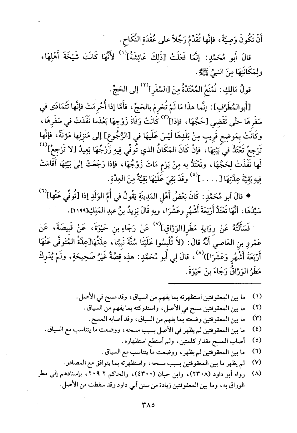 [أَبو المُطَرِّفِ]: إنَّما هذَا مَا لَمْ تُحْرِمْ بالحَجِّ، فأَمَّا إذا أُحْرِمَتْ فإنَّهاْ تَتَمَادَى في سَفَرِهَا حتَّى تَقْضِي [حَجَّهَا، فإذا] (¬3) كَانَتْ وَفَاةَ زَوْجِهَا بَعْدَما نَفَدَتْ في سَفَرِهَا، وكَانَتْ بِمَوضِع قَريبٍ مِنْ بَلَدِهَا لَيْسَ عَلَيهَا في [الرُّجُوعِ] إلى مَنْزِلها مَؤنَةً، فإنها تَرْجِعُ تَعْتَدُّ في بَيْتِهَا، فإنْ كَانَ المَكَانُ الذي توفي فِيهِ زَوْجُهَا بَعِيدٌ [لا تَرْجِعُ] (¬4) لَها نَفذَتْ لِحَجِّهَا، وتَعْتَدُّ به مِنْ يَوْمِ مَاتَ زَوْجُهَا، فإذا رَجَعَتْ إلى بَيْتِهَا أَقَامَتْ فِيهِ بَقِيَّةَ عِدَّتِهَا [....] (¬5) وقَدْ بَقِيَ عَلَيْهَا بقِيَّةٌ مِنَ العِدَّةِ.
