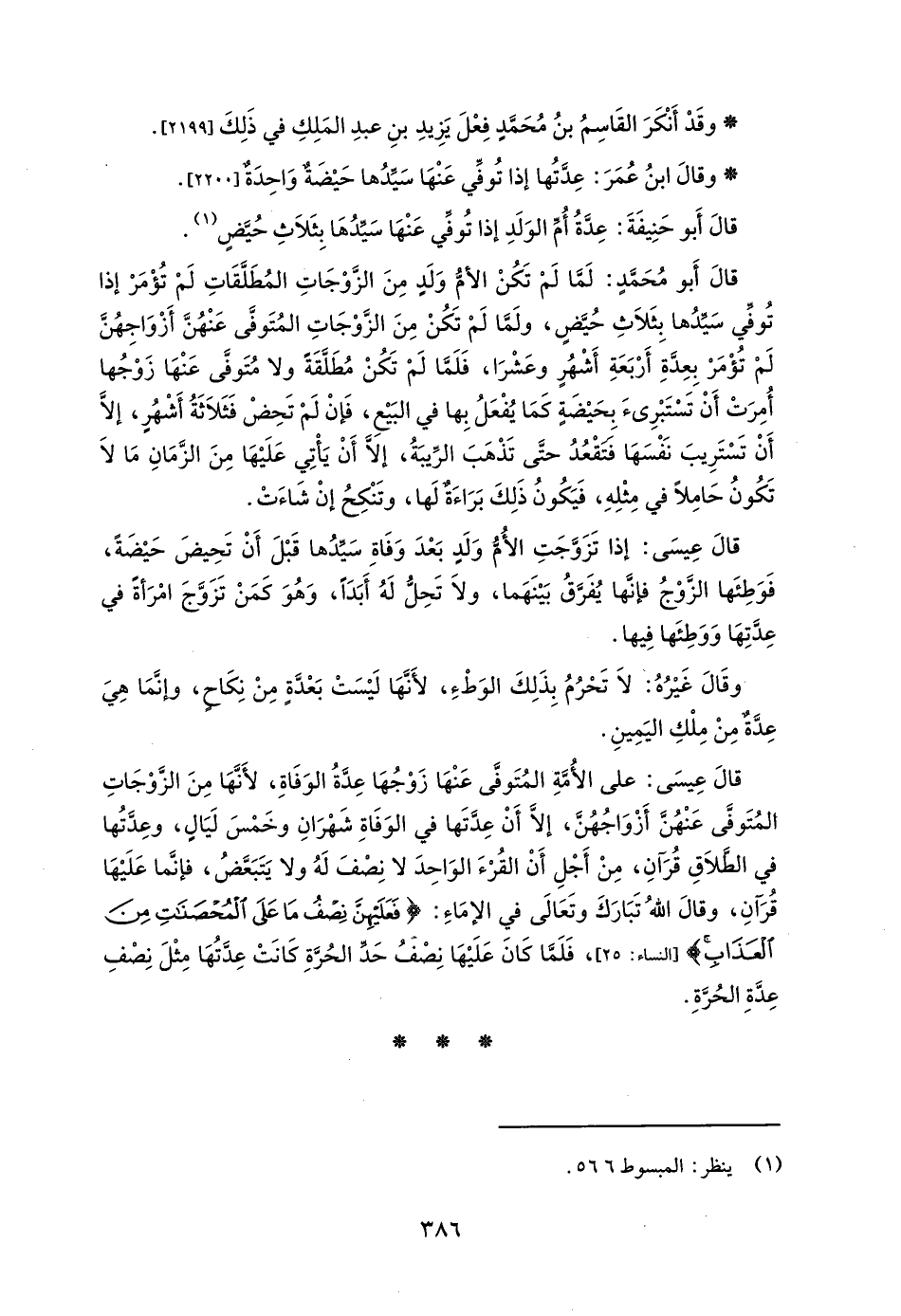 قالَ عِيسَى: على الأُمَّةِ المُتَوفَّى عَنْهَا زَوْجُهَا عِدَّةُ الوَفَاةِ، لأَنَّهَا مِنَ الزَّوْجَاتِ المُتَوفَّى عَنْهُنَّ أَزْوَاجُهُنَّ، إلَّا أَنْ عِدَّتَها في الوَفَاةِ شَهْرَانِ وخَمْسَ لَيَالٍ، وعِدَّتُها في الطَّلَاقِ قُرَآنِ، مِنْ أَجْلِ أَنْ القُرْءَ الوَاحِدَ لا نِصْفَ لَهُ ولا يَتَبَعَّضُ، فإنَّما عَلَيْهَا قُرَآنِ، وقالَ اللهُ تَبَارَكَ وتَعَالَى في الإمَاءِ: {فَعَلَيْهِنَّ نِصْفُ مَا عَلَى الْمُحْصَنَاتِ مِنَ الْعَذَابِ} [النساء: 25]، فَلَمَّا كَانَ عَلَيْهَا نِصْفُ حَدِّ الحُرَّةِ كَانَتْ عِدَّتُهَا مِثْلَ نِصْفِ عِدَّةِ الحُرَّةِ.