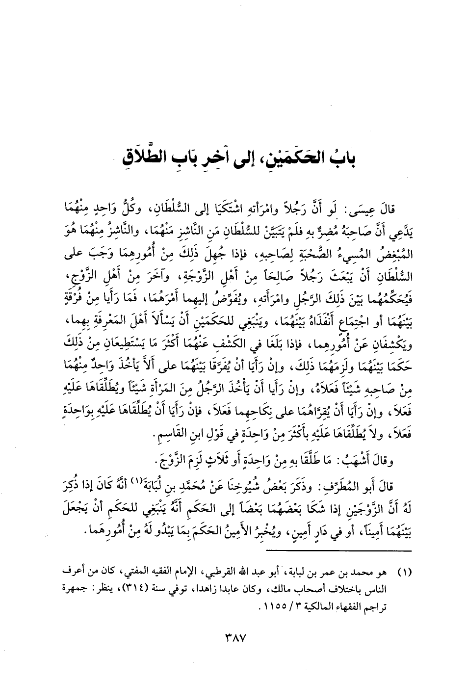 (¬1) هو محمد بن عمر بن لبابة، أبو عبد الله القرطبي، الإِمام الفقيه المفتي، كان من أعرف الناس باختلاف أصحاب مالك، وكان عابدا زاهدا، توفي سنة (314)، ينظر: جمهرة تراجم الفقهاء المالكية 3/ 1155.