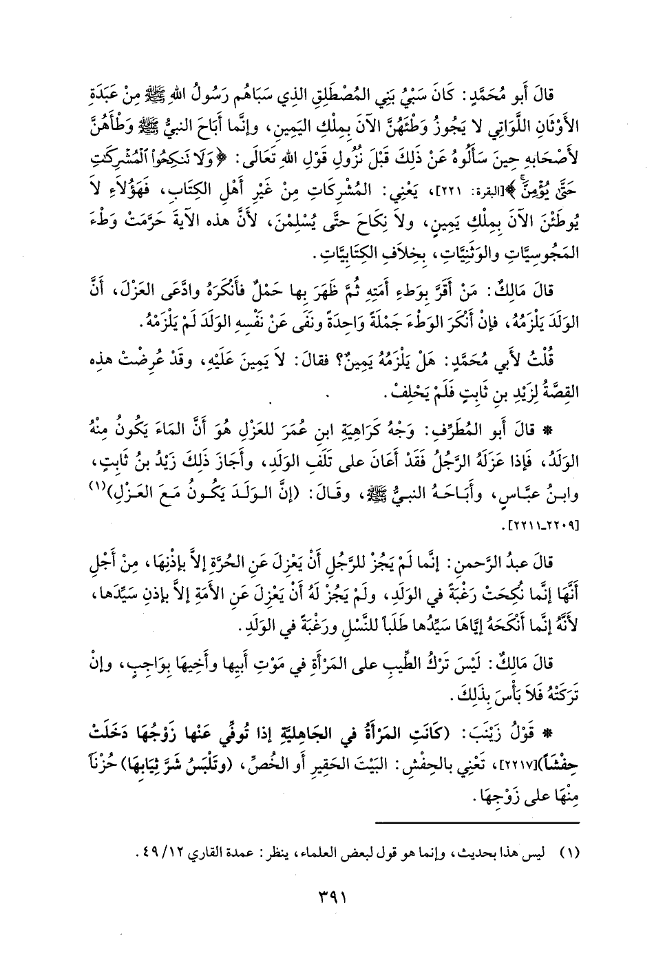 قالَ أَبو مُحَمَّدٍ: كَانَ سَبْيُ بَنِي المُصْطَلِقِ الذِي سَبَاهُم رَسُولُ اللهِ - صلى الله عليه وسلم - مِنْ عَبَدَةِ الأَوْثَانِ اللَّوَاتِي لا يَجُوزُ وَطْئَهُنَّ الآنَ بمِلْكِ اليَمِينِ، وإنَّما أَبَاحَ النبيُّ - صلى الله عليه وسلم - وَطْأَهُنَّ لأَصْحَابهِ حِينَ سَأَلُوهُ عَنْ ذَلِكَ قَبْلَ نُزُوَلِ قَوْلِ اللهِ تَعَالَى: {وَلَا تَنْكِحُوا الْمُشْرِكَاتِ حَتَّى يُؤْمِنَّ} [البقرة: 22]، يَعْنِي: المُشْرِكَاتِ مِنْ غَيْرِ أَهْلِ الكِتَابِ، فَهَؤُلاَءِ لَا يُوطَئْنَ الآنَ بِمِلْكِ يَمِينٍ، ولَا نِكَاحَ حتَّى يُسْلِمْنَ، لأَنَّ هذه الآيةَ حَرَّمَتْ وَطْءَ المَجُوسِيَّاتِ والوَثَنِيَّاتِ، بِخِلاَفِ الكِتَابِيَّاتِ.