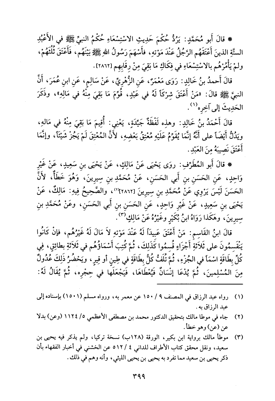 " قالَ أَبو مُحَمَّدٍ: يَرُدُّ حُكْمَ حَدِيثِ الإسْتِسْعَاءِ حُكْمُ النبيِّ - صلى الله عليه وسلم - في الأَعْبُدِ الستَّةِ الذينَ أَعْتَقَهُم الرَّجُلُ عَنْدَ مَوْتهِ، فأَسْهَمَ رَسُولُ اللهِ - صلى الله عليه وسلم - بَيْنَهُم، فَأَعْتَقَ ثُلُثَهُمْ، ولمْ يَأْمُرْهُم بالإسْتِسْعَاءِ في فِكَاكِ مَا بَقِيَ مِنْ رِقَابِهِم [2862].