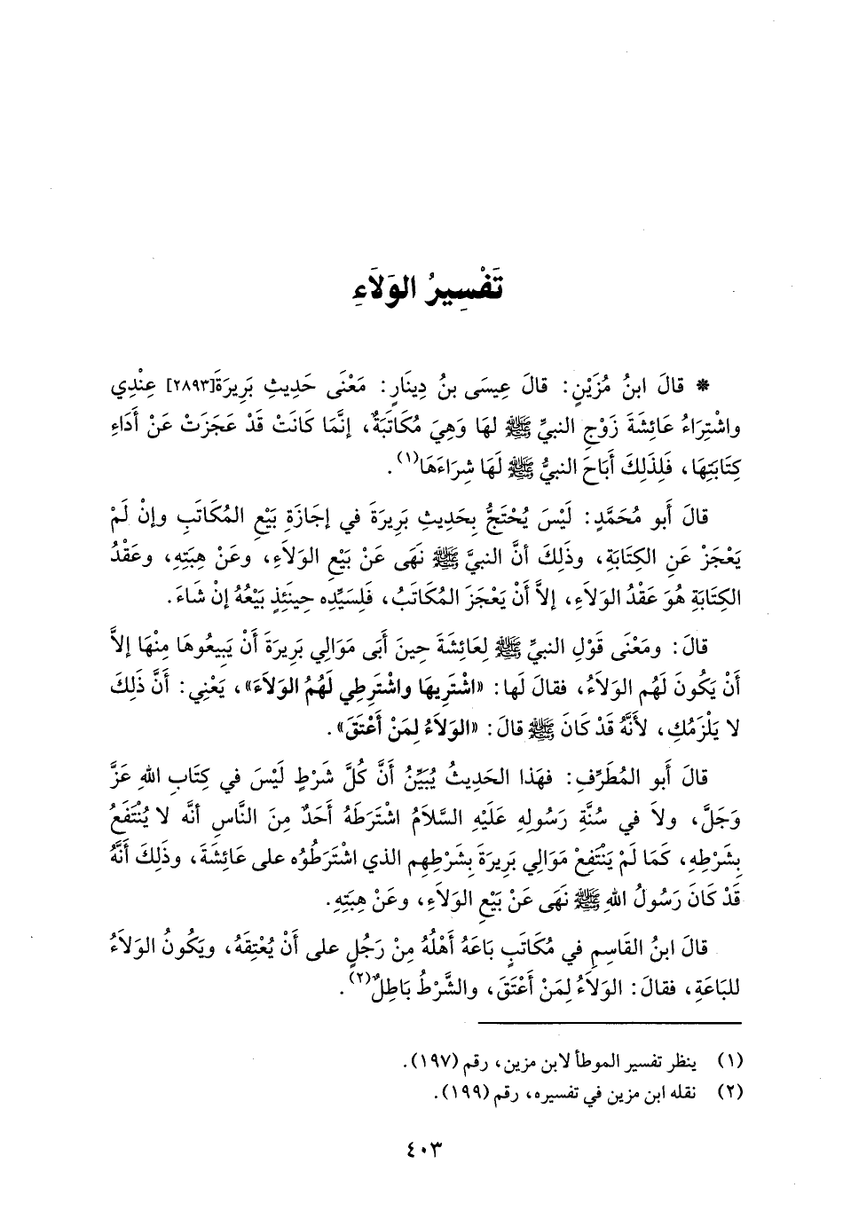 قالَ: ومَعْنَى قَوْلِ النبيِّ - صلى الله عليه وسلم - لِعَائِشَةَ حِينَ أَبَى مَوَالِي بَرِيرَةَ أَنْ يَبيعُوها مِنْها إلَّا أَنْ يَكُونَ لَهُم الوَلَاءُ، فقالَ لَها: "اشْتَرِيها واشْتَرِطِي لَهُمُ الوَلاَءَ"، يَعْنِي: أَنَّ ذَلِكَ لا يَلْزَمُكِ، لأَنَّهُ قَد كَانَ - صلى الله عليه وسلم - قالَ: "الوَلَاءُ لِمَنْ أَعتَقَ".