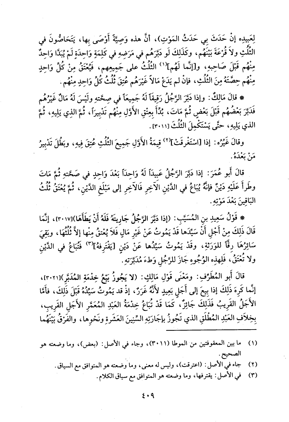 * قَوْلُ سَعِيدِ بنِ المُسَيبِ: (إذا دَبَّرَ الرَّجُلُ جَارِيتَهُ فَلَهُ أَنْ يَطَأَها) إنَّمَا قَالَ ذَلِكَ مِنْ أَجْلِ أَنْ سَيدَها قَدْ يَمُوتُ عَنْ غَيْرِ مَالٍ فَلَا يُعتقُ مِنْها إلاَ ثُلثها، وبَقِيَ سَائِرُها رِقَّاً للوَرَثةِ، وقَدْ يَمُوتُ سَيِّدُها عَنْ دَيْنٍ [يَقْتَرِفهُ] (¬3) فتبَاعُ في الدَّيْنِ