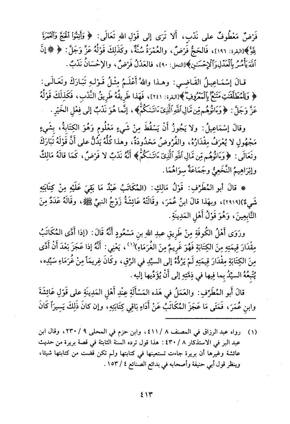 وقالَ إسْمَاعِيلُ: ولا يَجُوزُ أَنْ يَسْقُطَ مِنْ شَيء مَعلُومٍ وَهُوَ الكِتَابِةُ، بِشَيء مَجْهُولا لا يُعرَفُ مِقْدَارُهُ، والفُرُوضُ مَحدُودةٌ، وهذا كُلُّهُ يَدُلُّ على أَنَّ قَوْلَهُ تَبَارَكَ وتَعَالَى: {وَآتُوهُمْ مِنْ مَالِ اللهِ الَّذِي آتَاكُمْ} أَنَّهُ ندبٌ لا فَرضٌ، كَمَا قالَهُ مَالِكٌ وإبْرَاهِيمُ النَّخَعِيُ وجَمَاعَةٌ سِوَاهُمَا.