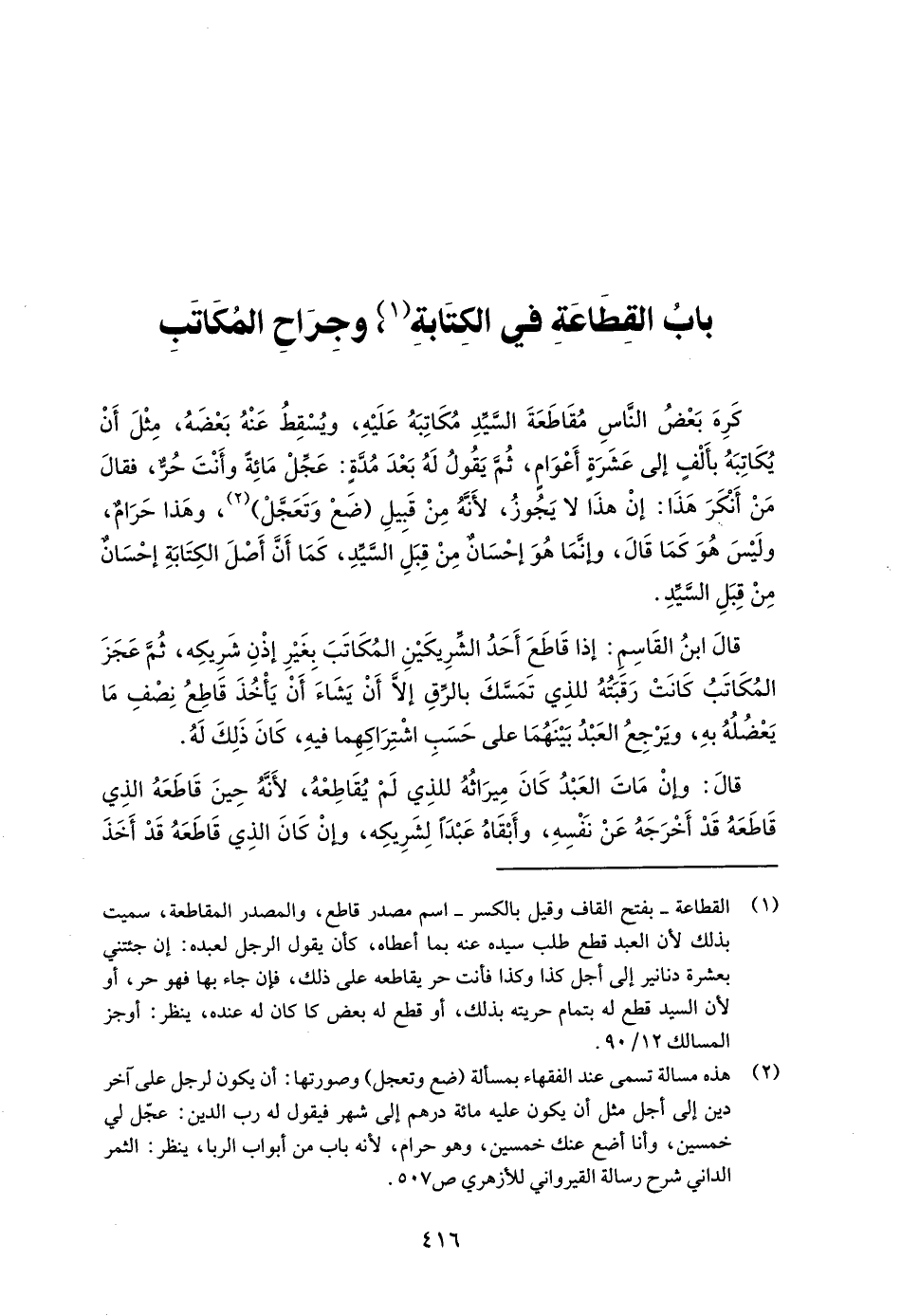 (¬1) القطاعة -بفتح القاف وقيل بالكسر- اسم مصدر قاطع، والمصدر المقاطعة، سميت بذلك لأن العبد قطع طلب سيده عنه بما أعطاه، كأن يقول الرجل لعبده: إن جئتني بعشرة دنانير إلى أجل كذا وكذا فأنت حر يقاطعه على ذلك، فإن جاء بها فهو حر، أو لأن السيد قطع له بتمام حريته بذلك، أو قطع له بعض كما كان له عنده، ينظر: أوجز المسالك 12/ 90.