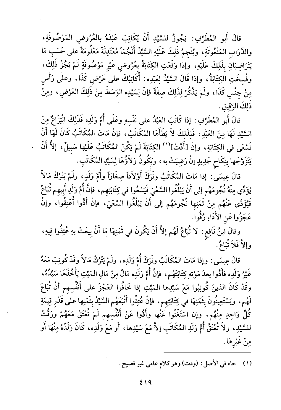 قالَ أَبو المُطَرِّفِ: يَجُوزُ للسَّيِّدِ أَنْ يُكَاتِبَ عَبْدَهُ بالعُرُوضِ المَوْصُوفَةِ، والدَّوَابِ المَنْعُوتَةِ، وُينْجِمُ ذَلِكَ عَلَيْهِ السَّيِّدُ أَنْجُمَا مُعتَدِلَةً مَعلُومَة على حَسَبِ مَا يَتَرَاضِيَانِ بِذَلِكَ عَلَيْهِ، وإذا وَقَعَتِ الكِتَابَةُ بعُرُوضٍ غَيْرِ مَوْصُوفَةٍ لَمْ يَجُزْ ذَلِكَ، وفُسِخَتِ الكِتَابَةُ، وإذا قَالَ السَّيِّدُ لِعَبْدِه: أُكَاتِبُكَ على عَرضِ كَذَا، وعلى رَأْسٍ مِنْ جِنْسِ كَذَا، ولَم يَذْكُز لِذَلِكَ صفَةً فإنْ لِسَيِّدِه الوَسَطَ مِنْ ذَلِكَ العَرضِ، ومِنْ ذَلِكَ الرَّقِيقِ.