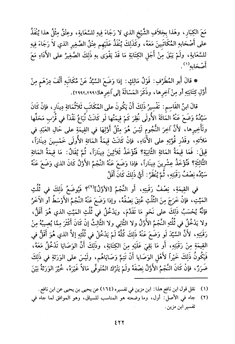 قالَ ابنُ القَاسِمِ: تَفْسِيرُ ذَلِكَ أَنْ يَكُونَ على المُكَاتَبِ ثَلاَثُمَائةِ دِينَارٍ، فإنْ كَانَ سَيِّدُهُ وَضَعَ عَنْهُ المَائَةَ الأُولَى نُظِرَ كَم قِيمَتُها لَو كَانَتْ تُبَاعُ نَقْدَاً في قُربِ مَحَلِّها وتَأْخِيرِها، لأَنَّ آخِرَ النُّجُومِ لَيْسَ هُوَ مِثْلُ أَوَّلها في القِيمَةِ على حَالِ العَبْدِ في مَلاَئهِ، وقَدْرِ قُوَّتِهِ على الأَدَاءِ، فإنْ كَانَتْ قِيمَةُ المَائةِ الأُولَى خَمسِينَ دِينَارَاً، قِيلَ: فَمَا قِيمَةُ المَائةِ الثَّانِيَةِ؟ فتؤْخَذُ ثَلاَثِينَ دِينَارَاً، ثُمَّ يُقَالُ: مَا قِيمَةُ المَائةِ الثَّالِثَةِ؟ فتؤْخَذُ عِشْرِينَ دِينَاراً، فإذا وَضَعَ عَنْهُ النَّجْمُ الأَوَّلُ كَانَ الذي وَضَعَ عَنْهُ سَيِّدُه نِصْفُ رَقَبَتِهِ، ثُمَّ يُنْظَرُ: أَيُّ ذَلِكَ كَانَ أَقَلَّ