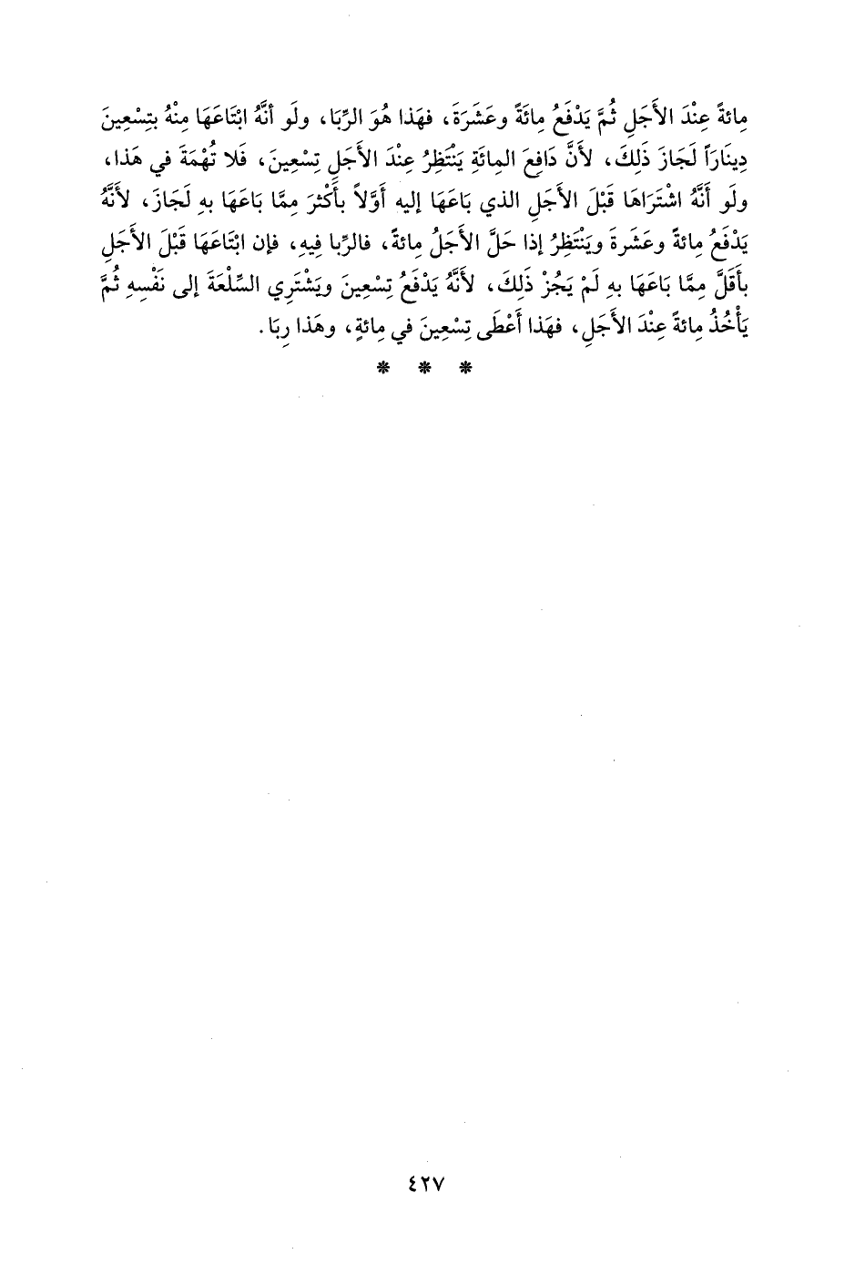 مِائةً عِنْدَ الأَجَلِ ثُمَّ يَنفَعُ مِائَةً وعَشَرَةَ، فهذا هُوَ الرِّبَا، ولَو أنَّهُ ابْتَاعَها مِنْهُ بتِسْعِينَ دِينَارَاً لَجَازَ ذَلِكَ، لأَنَّ دَافِعَ المِائَةِ يَنتظِرُ عِنْدَ الأَجَلِ تِسْعِينَ، فَلا تُهْمَةَ في هذا، ولَو أَنَّهُ اشْتَرَاها قَبْلَ الأَجَلِ الذي بَاعَها إليه أَوَّلاً بأَكْثرَ مِمَّا بَاعَها بهِ لَجَازَ، لأَنَّهُ يَدفَعُ مِائةً وعَشَرةَ ويَنْتَظِرُ إذا حَلَّ الأَجَلُ مِائةً، فالرِّبا فِيهِ، فإن ابْتَاعَةا قَبْلَ الأَجَلِ بأَقَلَّ مِمَّا بَاعها بهِ لَمْ يَجُزْ ذَلِكَ، لأَنَّهُ يَدفَعُ تِسْعِينَ وَيشْتَرِي السِّلْعَةَ إلى نَفْسِهِ ثم يَأْخُذُ مِائةً عِنْدَ الأَجَلِ، فهذا أَعطَى تِسْعِينَ في مِائةٍ، وهَذا رِبَا.