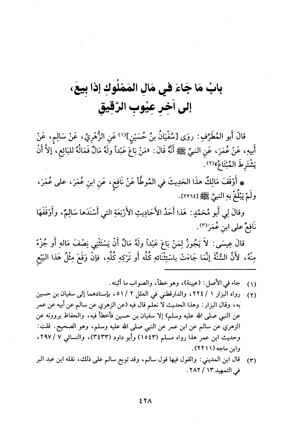 قالَ عِيسَى: لَا يَجُوزُ لِمَنْ بَاعَ عَبْداً ولَهُ مَالٌ أَنْ يَسْتَثْنِي نِصْفَ مَالهِ أَو جُزْءً مِنْهُ، لأَنَّ السُّنَّةَ إتمَا جَاءَتْ باسْتِثْنَائهِ كُلِّه أَو تَركِهِ كُلِّهِ، فإنْ وَقَعَ مِثْلُ هذا البَيْعِ