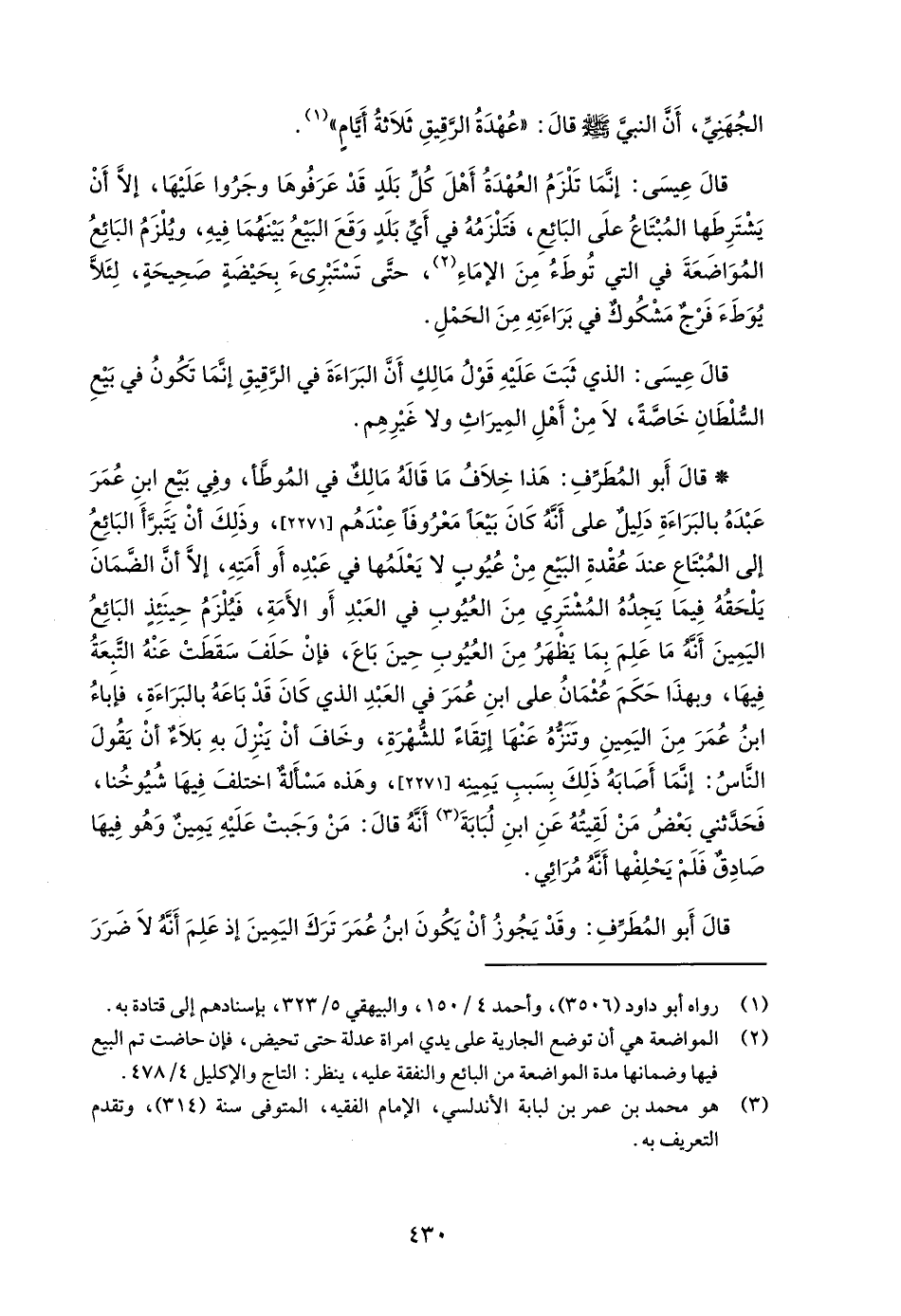* قالَ أَبو المُطَرفِ: هذا خِلاَفُ مَا قَالَهُ مَالِكٌ في المُوطَّأ، وفِي بَيْعِ ابنِ عُمَرَ عَبْدَهُ بالبَرَاءَةِ دَلِيلٌ على أَنَّهُ كَانَ بَيْعَاً معرُوفَاً عِنْدَهُم، وذَلِكَ أنْ يَتَبرَّأَ البَائِعُ إلى المُبْتَاعِ عندَ عُقْدةِ البَيع مِنْ عُيُوب لا يَعلَمُها في عَبْدِه أَو أَمَتِهِ، إلَّا أنَّ الضمَان يَلْحَقُهُ فِيمَا يَجِدُهُ المُشْتَرِي مِنَ العُيُوبِ في العَبْدِ أَو الأَمَةِ، فَيُلْزَمُ حِينَئِذٍ البَائِعُ اليَمِينَ أَنَّهُ مَا عَلِمَ بِمَا يَظْهرُ مِنَ العُيُوبِ حِينَ بَاعَ، فإنْ حَلَفَ سَقَطَتْ عَنْهُ التَّبعَةُ فِيها، وبهذَا حَكَمَ عُثْمَانُ على ابنِ عُمَرَ في العَبْدِ الذي كَانَ قَدْ بَاعَهُ بالبَرَاءَةِ، فإَباءُ ابنُ عُمَرَ مِنَ اليَمِينِ وتَنَزُّهُ عَنْها إتِقَاء للشُّهْرَةِ، وخَافَ أنْ يَنْزِلَ بهِ بَلاَءٌ أنْ يَقُولَ النَّاسُ: إنَّمَا أَصَابَهُ ذَلِكَ بِسَببِ يَمِييه، وهذه مَسْأَلةٌ اختلفَ فِيها شُيُوخُنا، فَحَدَّثني بَغضُ مَنْ لَقِيتُهُ عَنِ ابنِ لُبَابَةَ (¬3) أَنَّهُ قالَ: مَنْ وَجَبتْ عَلَيْهِ يَمِينٌ وَهُو فِيها صَادِقٌ فَلَم يَخلِفْها أَنَّهُ مُرَائِي.