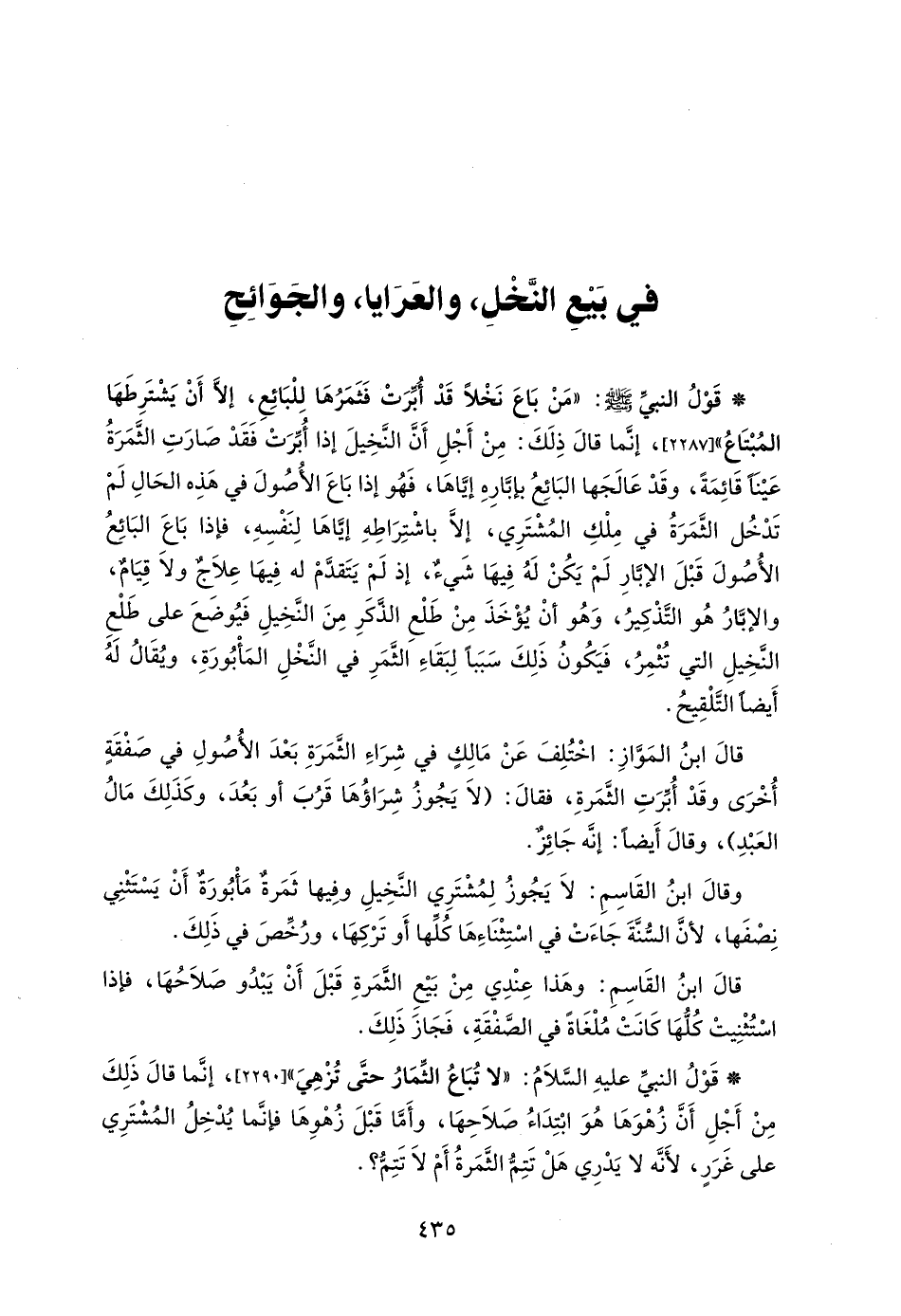 قَوْلُ النبيِّ - صلى الله عليه وسلم -: "مَنْ بَاعَ نَخْلاً قَدْ أُبرَتْ فَثَمَرُها لِلْبَائِعِ، إلَّا أَنْ يَشْتَرِطها المُبْتَاعُ"، إنَّما قالَ ذِلَكَ: مِنْ أَجْلِ أَنَّ النَّخِيلَ إذا أُبِّرَتْ فَقَدْ صَارَتِ الثَّمَرَةُ عَيْنَاً قَائِمَة، وقَدْ عَالَجَها البَائِعُ بإبَّارِهِ إيَّاها، فَهُو إذا بَاعَ الأُصُولَ في هذِه الحَالِ لَمْ تَدخُل الثَّمَرَةُ في مِلْكِ المُشْتَرِي، إلَّا باشْتِرَاطِهِ إيَّاها لِنَفْسِهِ، فإذا بَاعَ البَائِعُ الأُصُولَ قَبْلَ الإبَّارِ لَمْ يَكُنْ لَهُ فِيها شَيءٌ، إذ لَمْ يَتَقدَّف له فِيها عِلاِجٌ ولَا قِيَامٌ، والإبَّارُ هُو التَّذْكِيرُ، وَهُو أنْ يُؤْخَذَ مِنْ طَلْعِ الذَّكَرِ مِنَ النَّخِيلِ فَيُوضعَ على طَلْعِ النَّخِيلِ التي تُثْمِرُ، فَيَكُونُ ذَلِكَ سَبَباً لِبَقَاءِ الثَّمَرِ في النَّخْلِ المَأْبُورَةِ، ويُقَالُ لَهُ أَيضاً التَّلْقِيحُ.