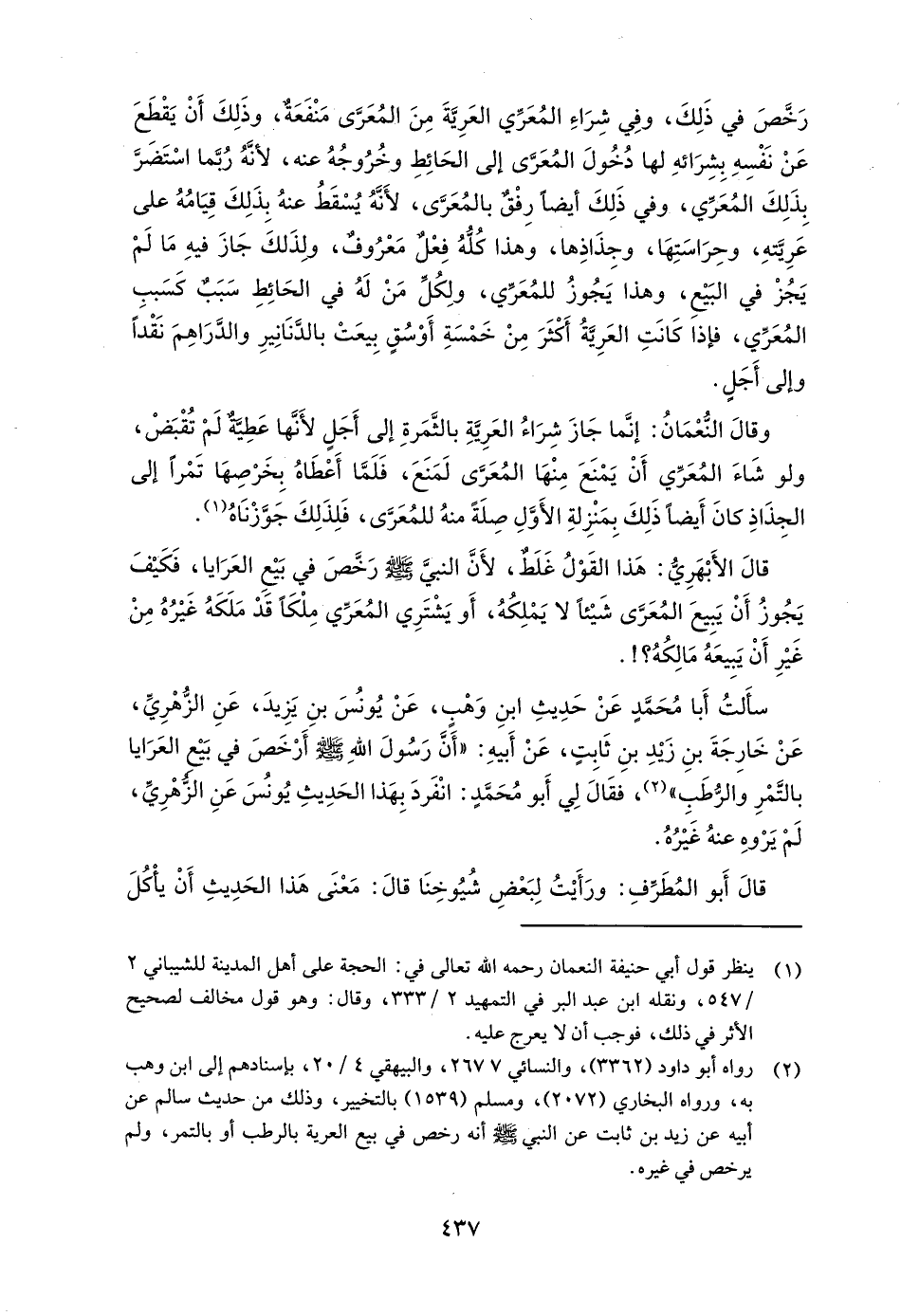 وقالَ النُّعمَانُ: إنَّما جَازَ شِرَاءُ العَرِيَّةِ بالثَّمَرةِ إلى أَجَلٍ لأَنَّها عَطِيّه لَمْ تُقْبَضْ، ولو شَاءَ المُعَرِّي أَنْ يَمنَعَ مِنْها المُعَرَّى لَمَنَعَ، فَلَمَّا أَعطَاهُ بِخَرصِها تَمراً إلى الجِذَاذِ كانَ أَيضاً ذَلِكَ بِمَنْزِلةِ الأَوَّلِ صِلَةً منهُ للمُعَرَّى، فَلِذَلِكَ جَوَّزْنَاهُ (¬1).