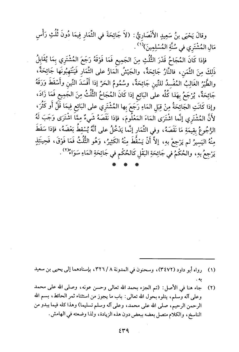 (¬2) جاء هنا في الأصل: (تم الجزء بحمد الله تعالى وحسن عونه، وصلى الله على محمد وعلى آله وسلم، يتلوه بحول الله تعالى: باب ما يجوز من استثناء ثمر الحائط، بسم الله الرحمن الرحيم، صلى الله على محمد، وعلى آله وسلم تسليما) وهذا كله فيما يبدو من الناسخ، والكلام متصل بعضه ببعض دون هذه الزيادة، ولذا وضعته في الهامش.